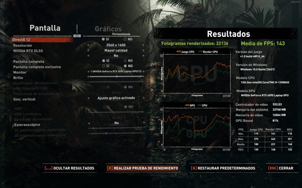 Con esta unidad gráfica podremos ejecutar todo lo que se nos ocurra y en calidad ultra. Por ejemplo, se podrán jugar sin problemas algunos títulos como Elden Ring, Cyberpunk 2077, Wolfenstein Youngblood, PUBG, o el Shadow of the Tomb Raider. Todo ejecutados en su máxima calidad gráfica y a una tasa de cuadros sobre 100 fps (para el juego más pesado) o más. Igualmente, revisé la temperatura de la GPU NVIDIA GeForce RTX 4090 y con estos juegos que son pesados, y la temperatura no pasó de los 75 grados. Acá lamentablemente no podremos sacar el máximo de fps alineados con los 240 Hz de la pantalla, debido a que estos juegos de tipo triple A demandan mucha carga gráfica, aun así, podrán disfrutarse de manera super fluida.