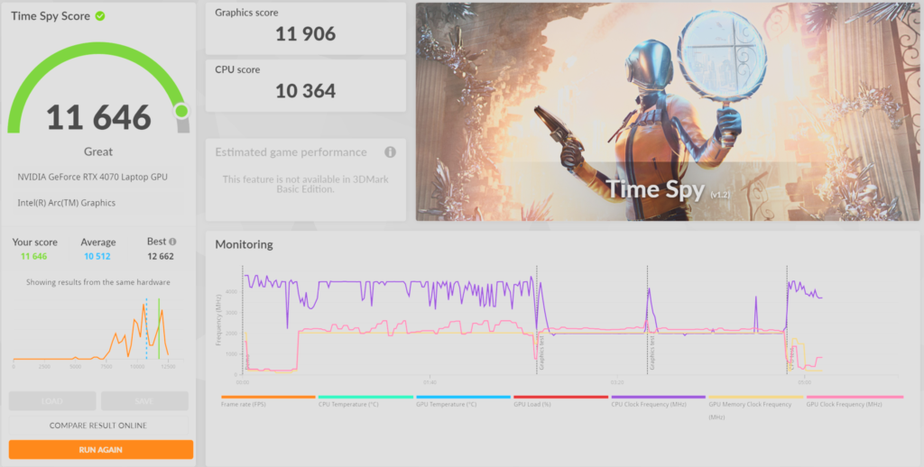 El test 3DMARK fue utilizado para revisar el rendimiento de la GPU y CPU del equipo mediante la opción Time Spy Score que incluye, aunque aquí se hace notar que el procesador de este equipo, si bien es de última generación, no corresponde a una de las generaciones más potentes entre los procesadores, ya que es para laptos ultra delgados, aunque aún así su resultado es bastante superior al promedio entregado por los creadores de la aplicación.