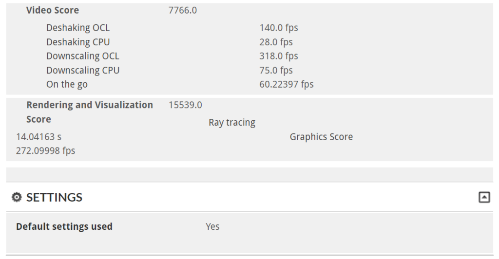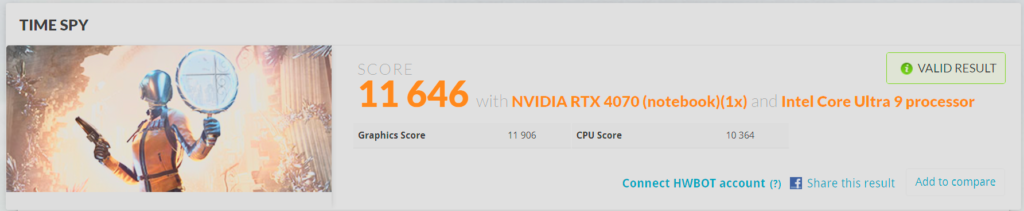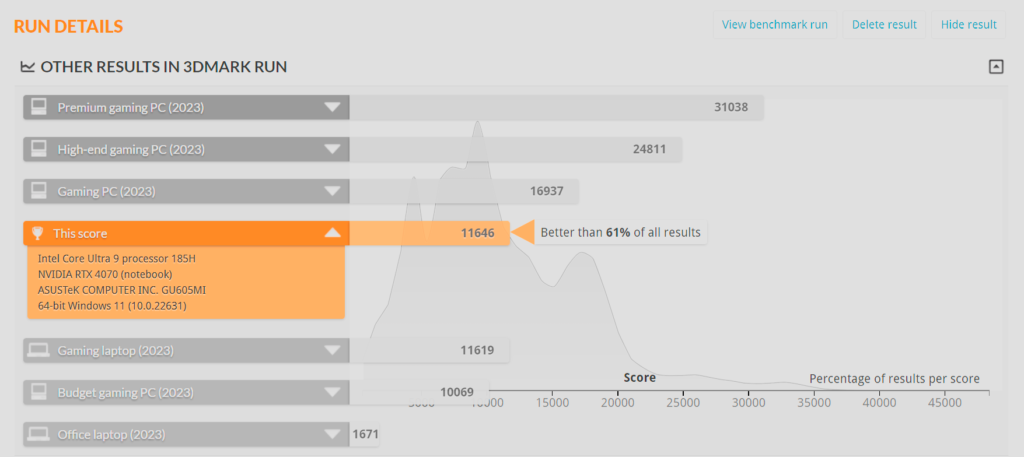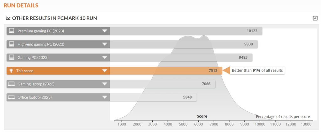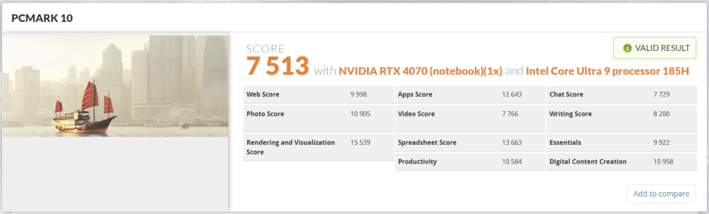 De acuerdo con los resultados obtenidos de este test, se encontraría dentro del 9% de mejores resultados, al obtener un puntaje de 7513 ptos., superando la barrera de los 7 mil puntos para notebooks gamers, pero sin llegar a alcanzar a otros computadores gamers ya más potentes. También cabe destacar, que los puntajes en otro tipo de cargas de trabajo fueron más destacados, como en el uso de aplicaciones, trabajo con hojas de datos, renderización y visualización, entre otros.