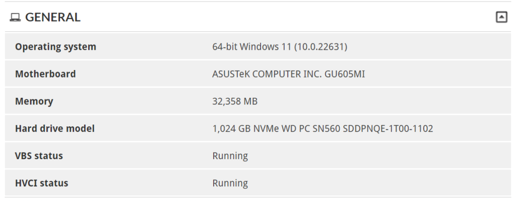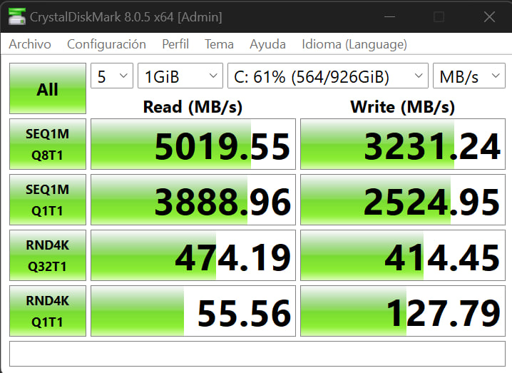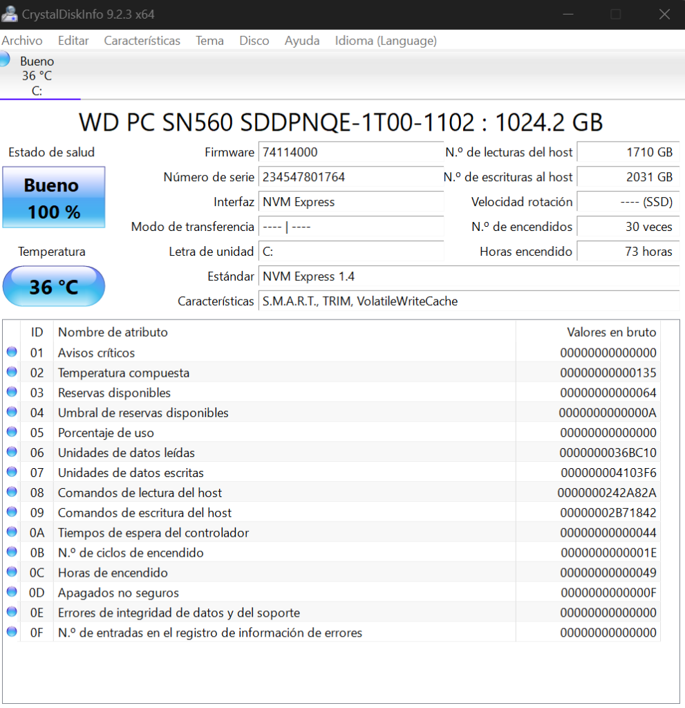 Este test, así como los que vienen a continuación, fueron realizados para obtener información más detallada del equipo, así como para saber de la unidad de almacenamiento, sus detalles y estado de salud, así como también para revisar sus velocidades de lectura y escritura.