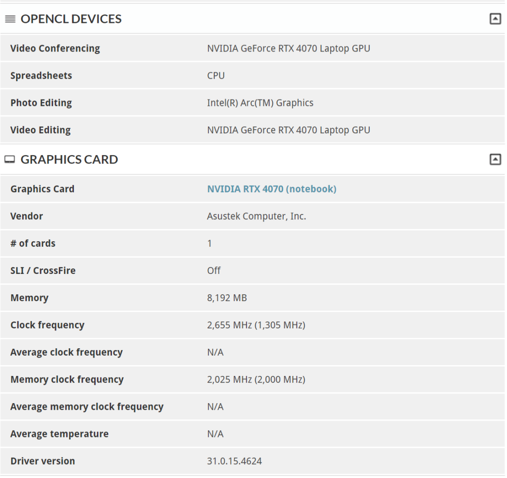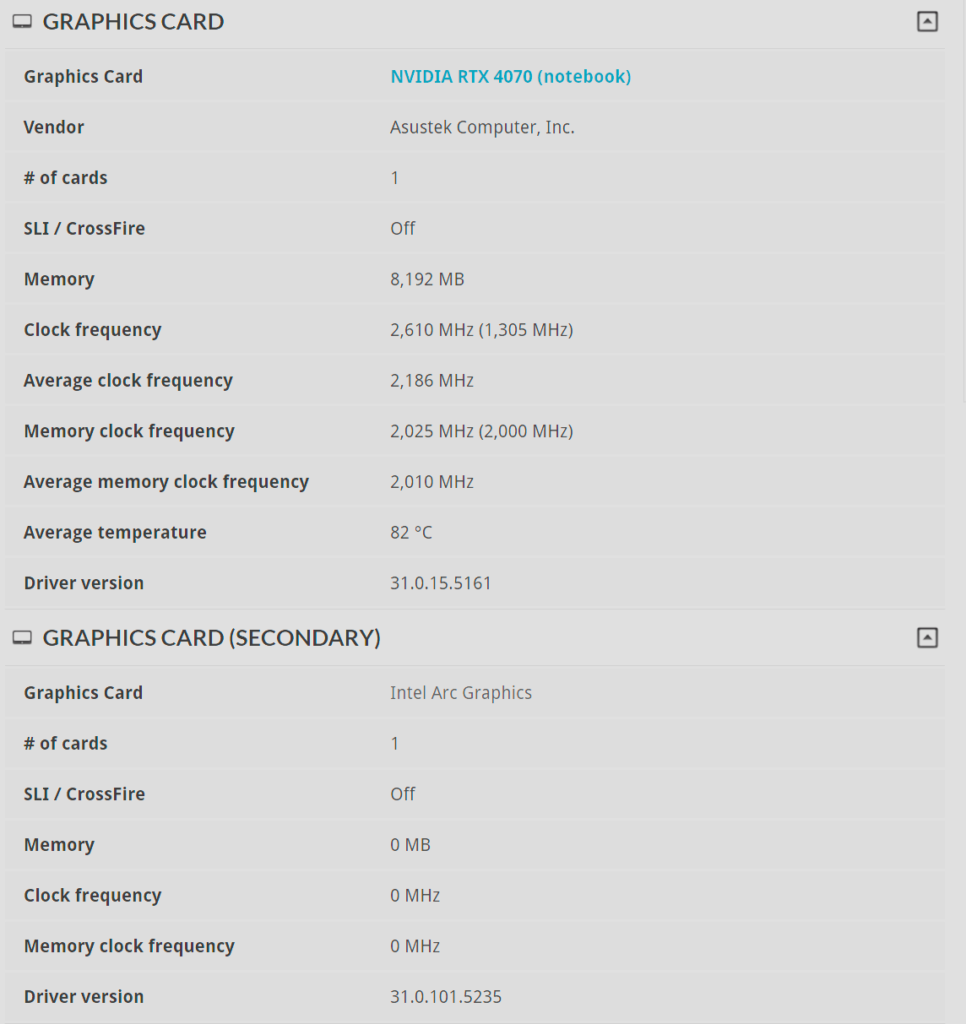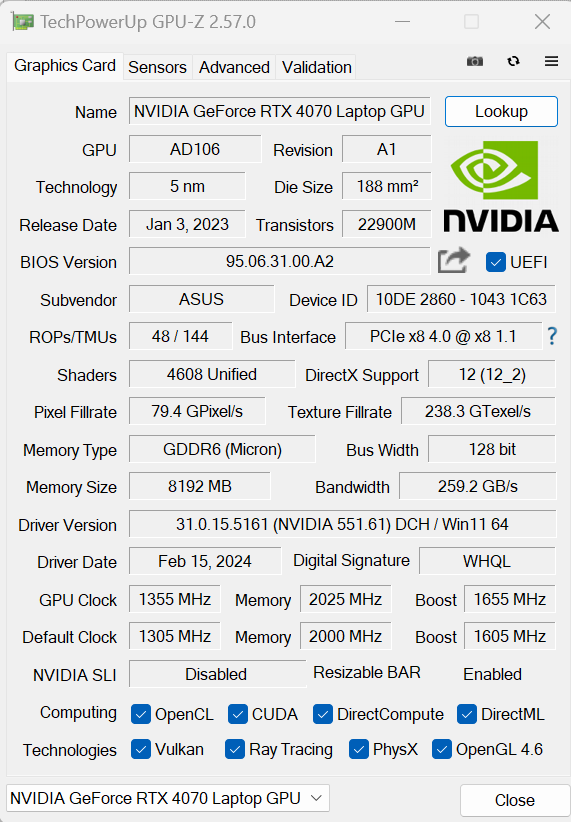 Acompañando a este CPU, se incluye una tarjeta gráfica NVIDIA GeForce RTX 4070 para laptops, con un TGP máximo de 115 vatios. Este modelo viene con rendimiento acelerado por IA, ray tracing, NVIDIA Broadcast entre otras tecnologías de NVIDIA.