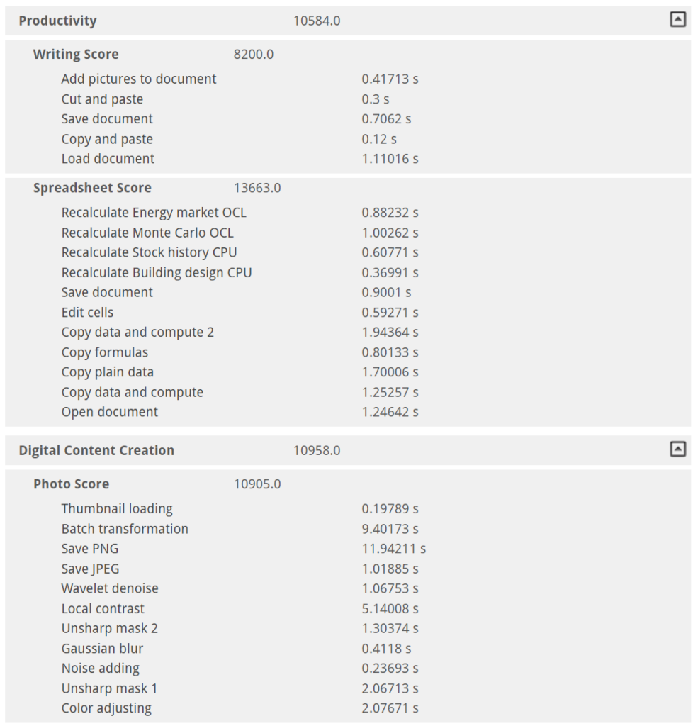 Este test fue realizado para revisar el rendimiento del equipo bajo diversas cargas de trabajo, entre las que se incluyen por ejemplo, lectura de datos, escritura de datos, trabajo con hojas de datos, edición de video, render y visualización, navegación web, video conferencias, entre otras.