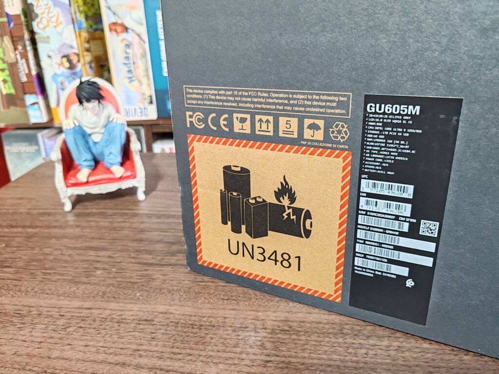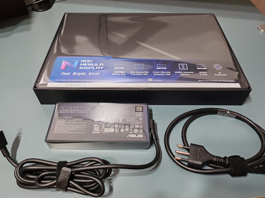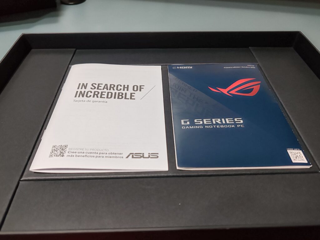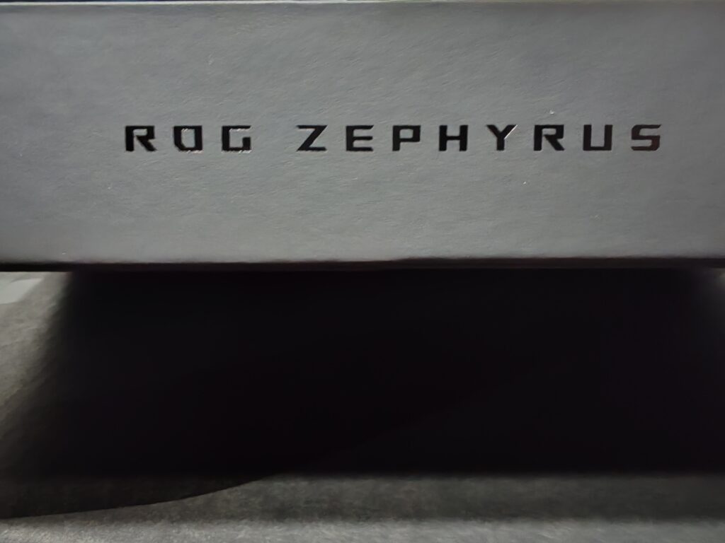 La caja, principalmente en tonos de negro y gris, exhibe simplemente el nombre de la línea de productos "Republic of Gamers" y "ROG Zephyrus" en uno de sus bordes, además del distintivo logo holográfico de ASUS. Al abrirla, nos topamos de inmediato con el equipo, que en este caso corresponde a la versión color Eclipse Gray, bajo el cual se sitúa la fuente de alimentación y una caja más pequeña, también con el logo holográfico de Asus, que contiene manuales de usuario y la garantía del equipo.