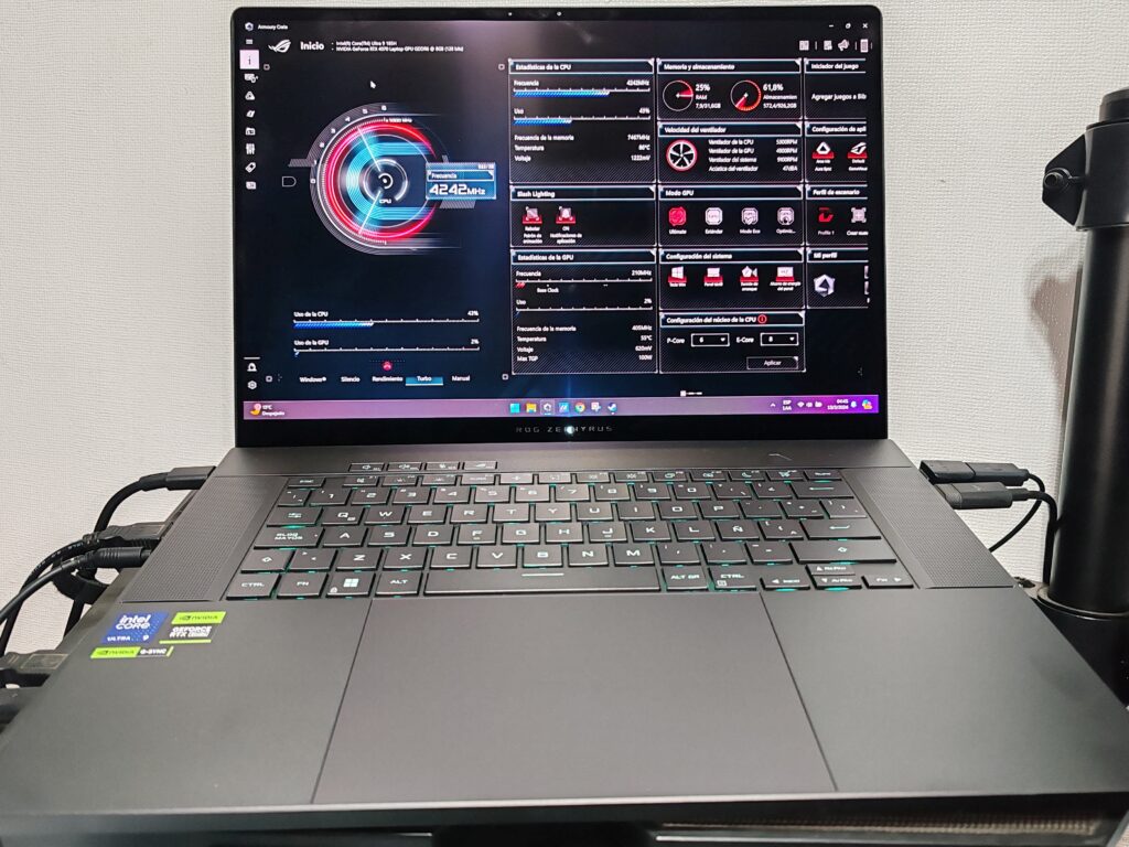A pesar de la potencia, el Zephyrus G16 se mantiene relativamente silencioso durante el uso normal, aunque los ventiladores pueden volverse ruidosos en momentos de alta exigencia con el modo turbo.
