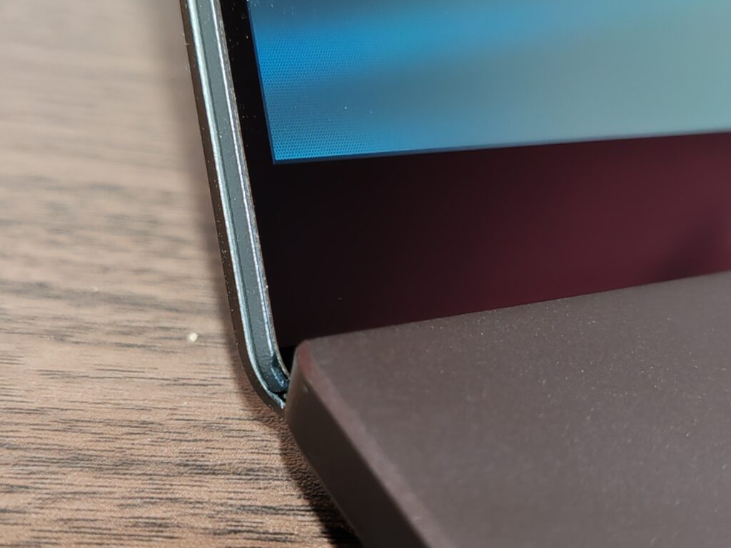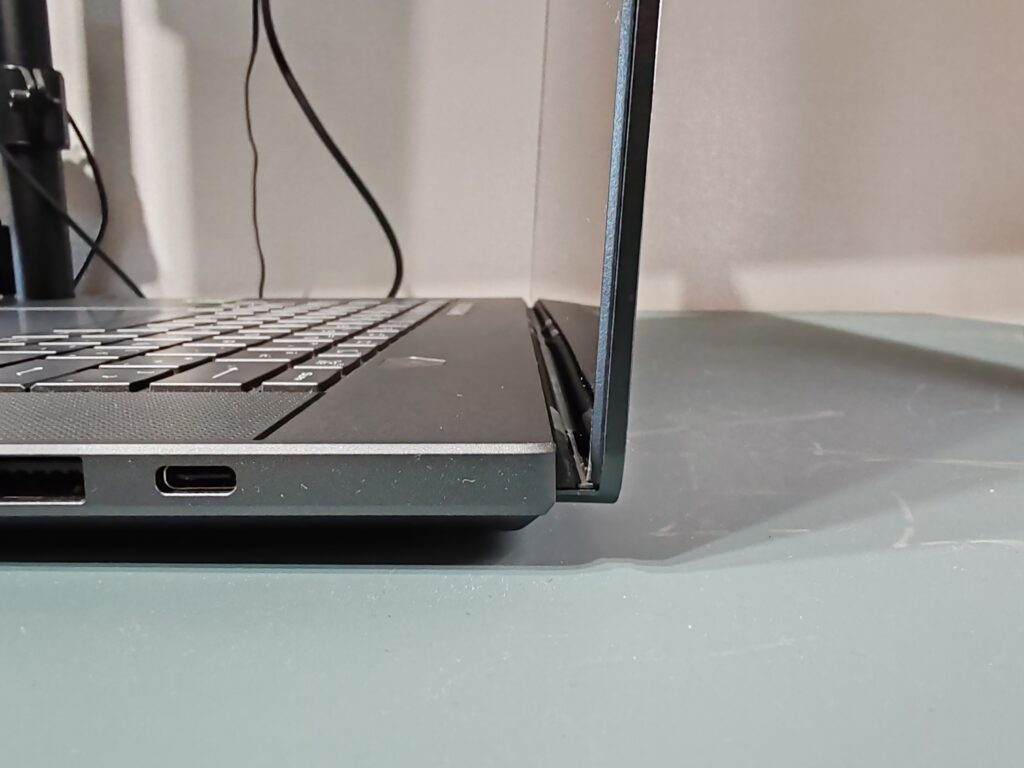 Empezando con la pantalla, esta ocupa aproximadamente el 88,4% de la superficie total debido a sus biseles extremadamente delgados, reservando un área más ancha en el borde superior para alojar la cámara y el sensor IR utilizado para el reconocimiento facial y que cuenta con soporte Windows Hello.