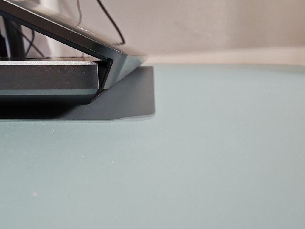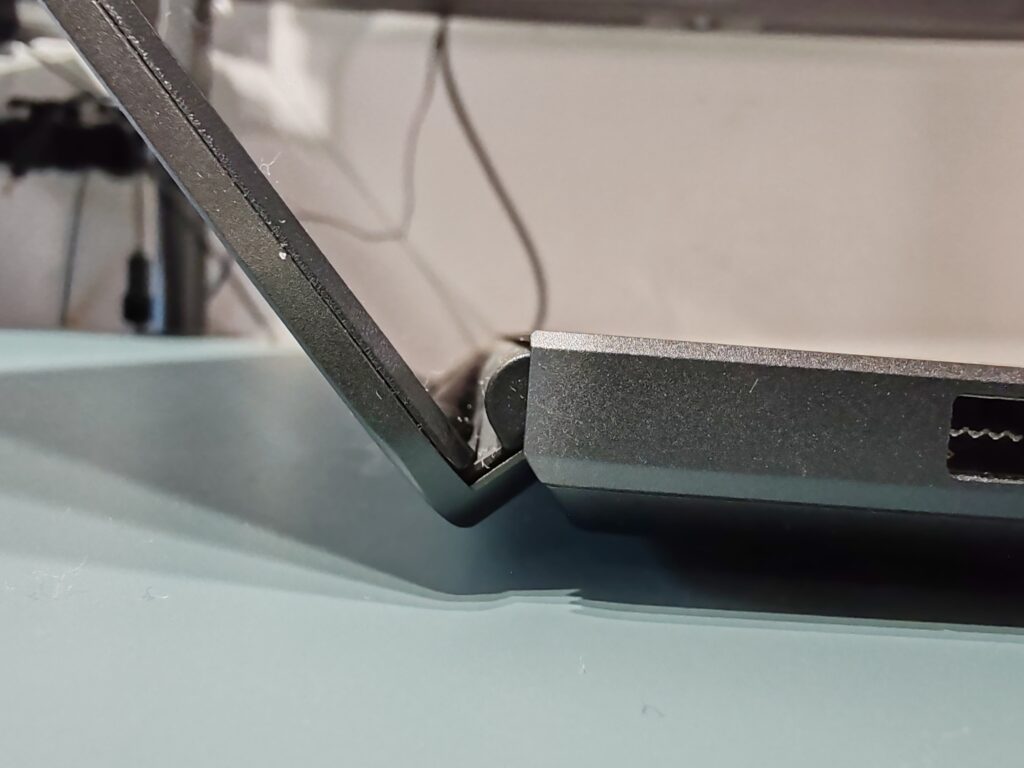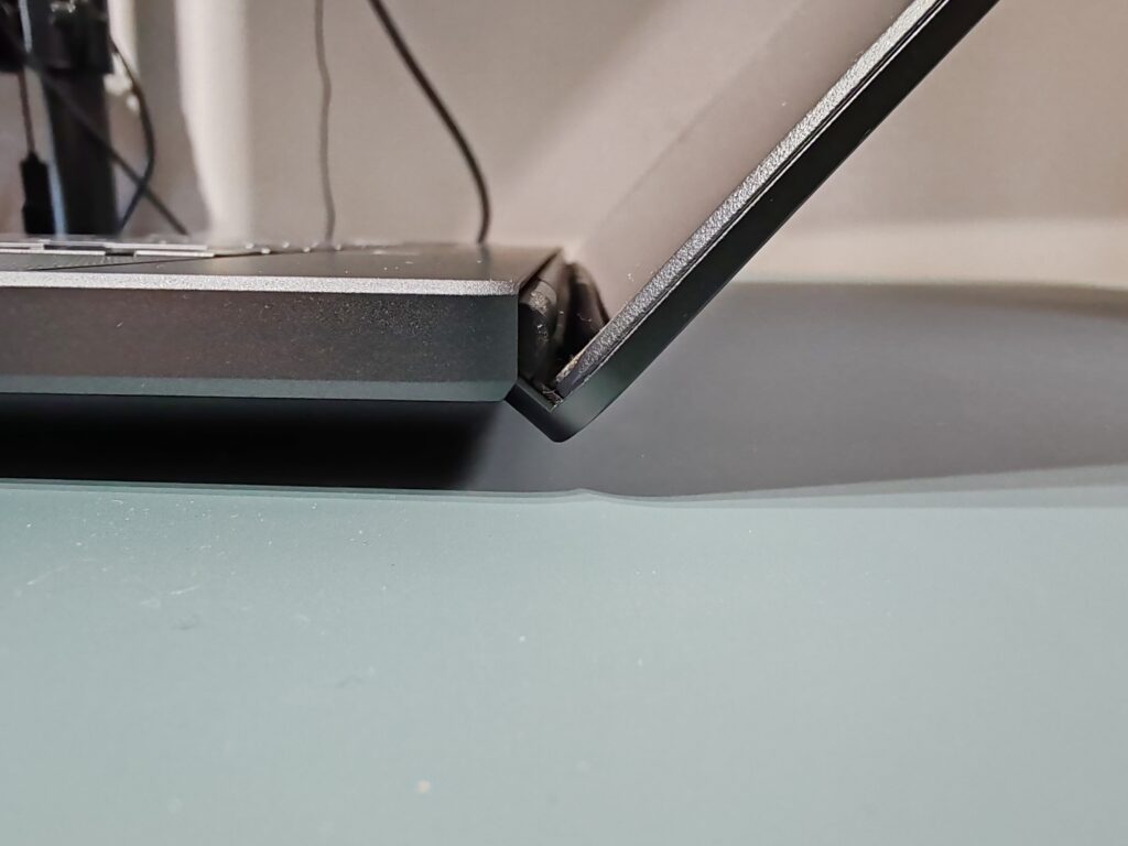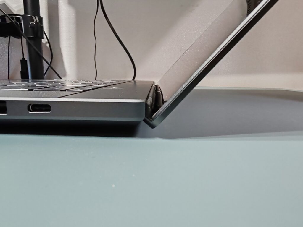 Al abrir la pantalla, nos encontramos con sus particulares bisagras ocultas, que le permite mantener un diseño pulcro y elegante, dando la sensación de que el computador está formado por una única pieza, sin agujeros ni huecos adicionales. Además de ser algo estético, la salida de aire que se encuentra en la parte trasera toma la dirección de acuerdo con la forma de la bisagra, evitando que el aire caliente salga en dirección a la pantalla LED.