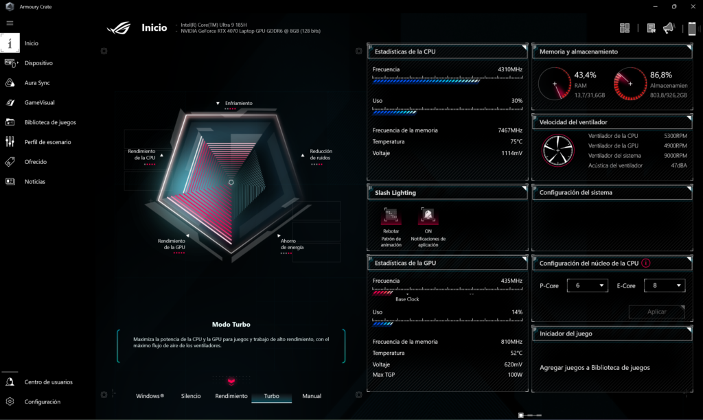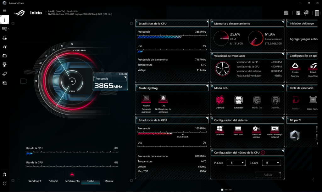 Con esta herramienta de ASUS, es posible estar monitoreando el equipo, así como también realizar cambios de manera rápida, como por ejemplo pasar al modo turbo del procesador, el cual no solo mejora el rendimiento, sino que también aumenta el nivel de ruido, aunque no tanto como otros equipos de la serie Strix. También es posible cambiar el modo GPU entre Ultimate o Estándar, y acceder a configuraciones de iluminación, guardar configuraciones predefinidas para cambiar rápidamente de una configuración a otra entre otras opciones que posee.