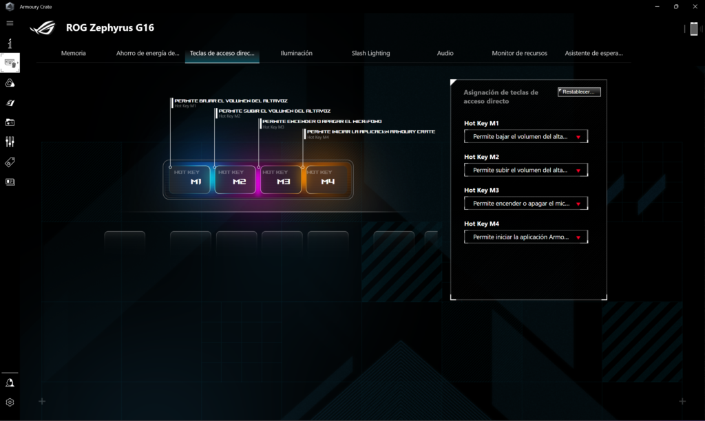 El teclado cuenta con iluminación RGB, la que se puede configurar de diferentes maneras mediante el uso del software Asus Armoury Crate que viene incorporado.