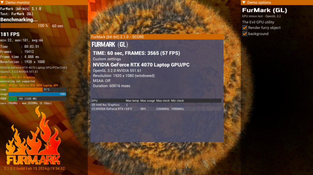 El último test que se realizó fue FurMark. Este test fue para revisar y conocer el estado de la tarjeta gráfica y las temperaturas de funcionamiento mediante un stress test a la tarjeta gráfica, no presentando inconvenientes en este caso, considerando que se trata de un notebook nuevo y no tuvo mayores problemas aunque el tiempo de ejecución del test fue bajo.
