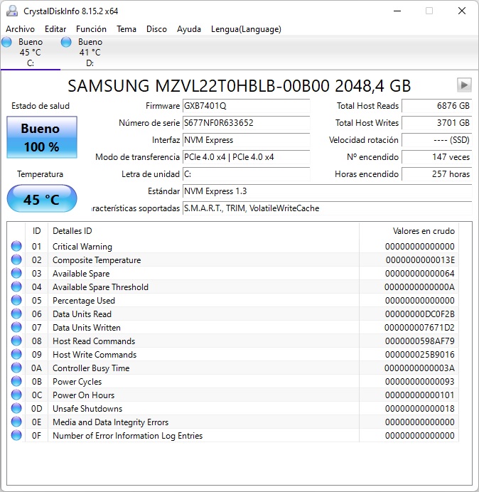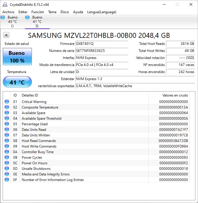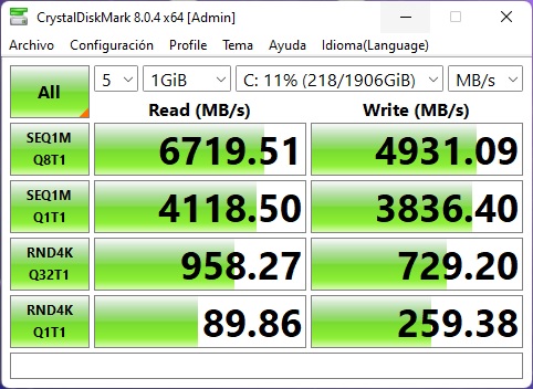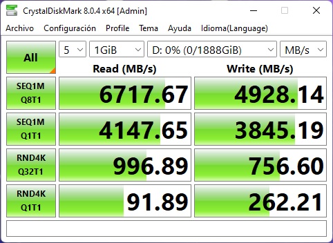 Respecto al almacenamiento, el portátil cuenta con dos módulos SSD M.2 de 2 TB cada uno dando un total de 4 TB. A su vez, el almacenamiento posee bus NVMe con la última versión PCIe, la 4.0. Al momento de revisar su rendimiento, ambos presentaron un comportamiento similar con velocidades aproximadas en lectura de 6.700 MB/s y 4.900 MB/s de escritura. Con estas características transferir archivos o abrir aplicaciones será pan comido gracias a su enorme rapidez.