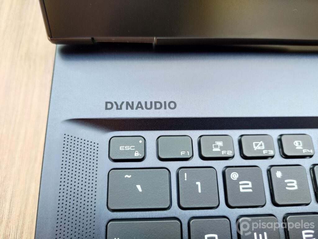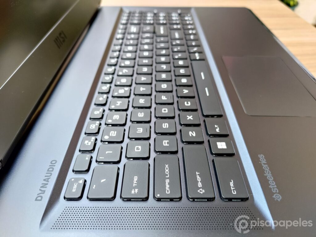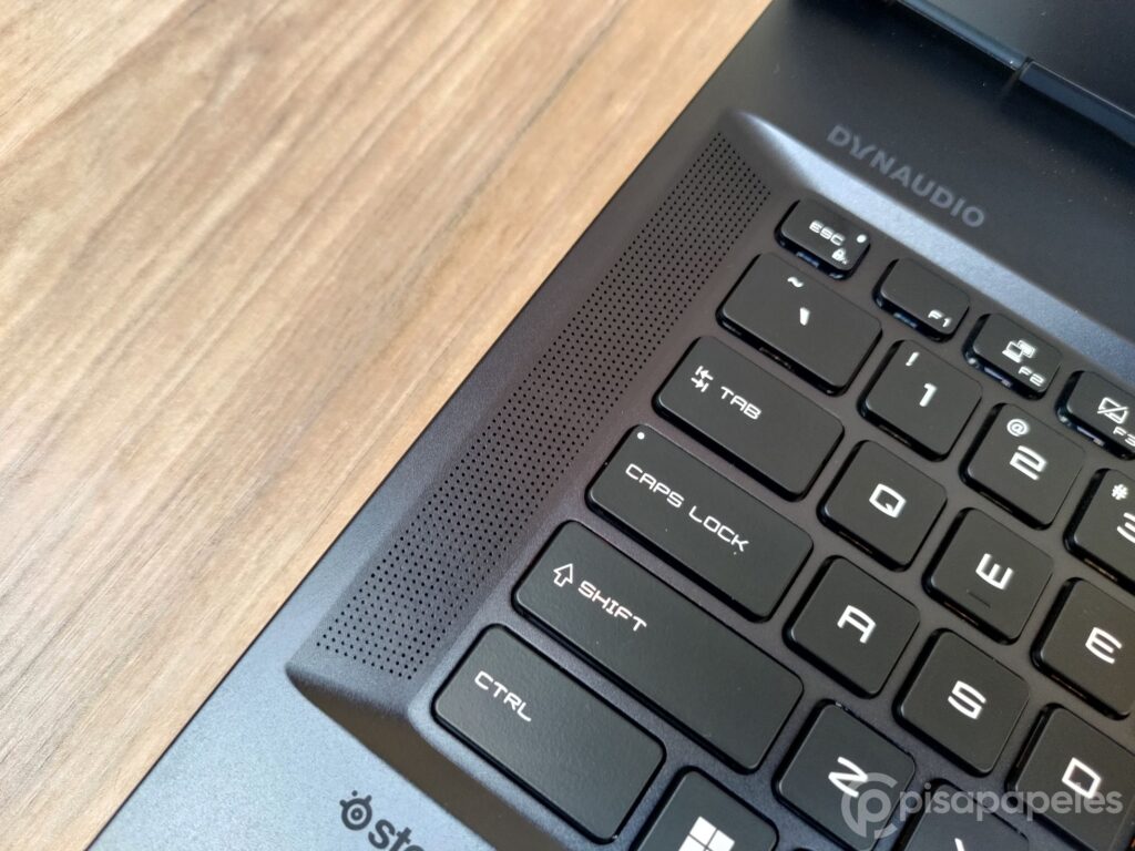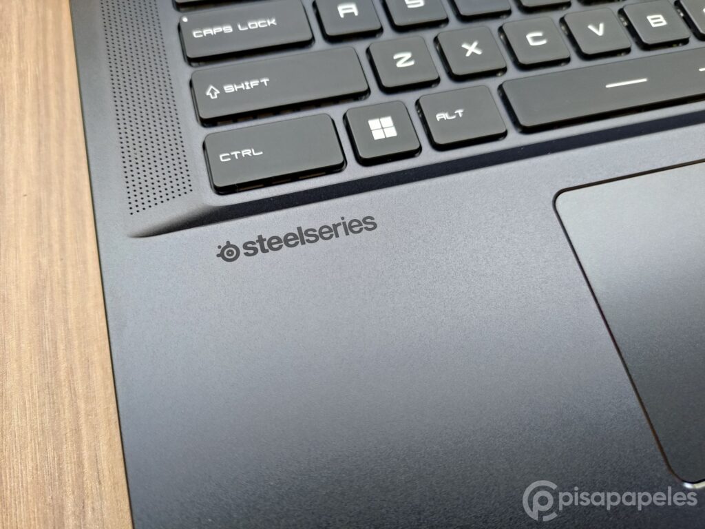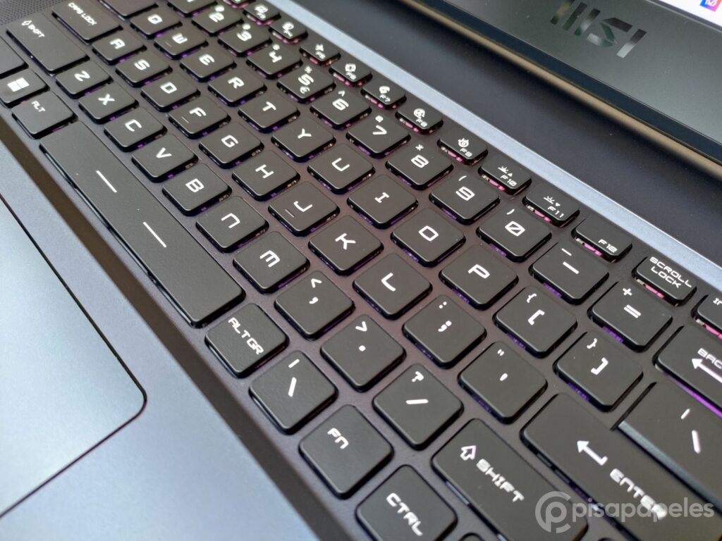 El teclado posee retroiluminación por LED RGB por tecla que se puede personalizar, pero no me ha gustado el brillo final que posee. Traté de aumentar la luz al máximo, pero sigue siendo muy tenue en comparación a otros equipos. En gran parte de las teclas F1 al F12 hallamos accesos directos para funciones como el modo vuelo, activar perfiles del ventilador, bloquear el trackpad, cambiar la salida de video y más.