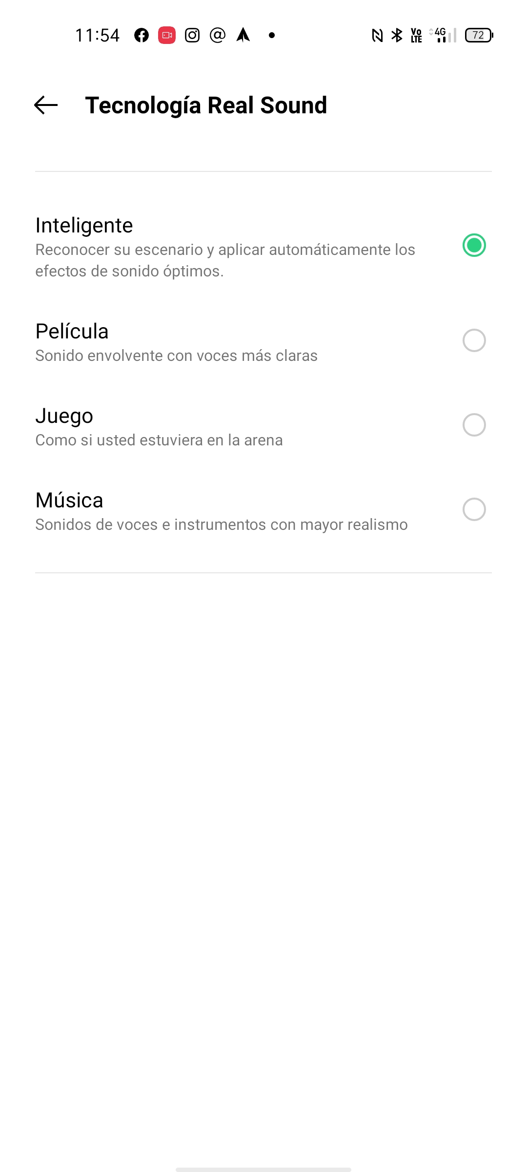 Como podrás apreciar en la captura, cada perfil se adapta de acuerdo con el tipo de contenido que estás escuchando, mientras que el modo “Inteligente” los reconoce y aplica de manera automática. Lamentablemente ninguno es personalizable, ni tampoco tenemos un ecualizador.