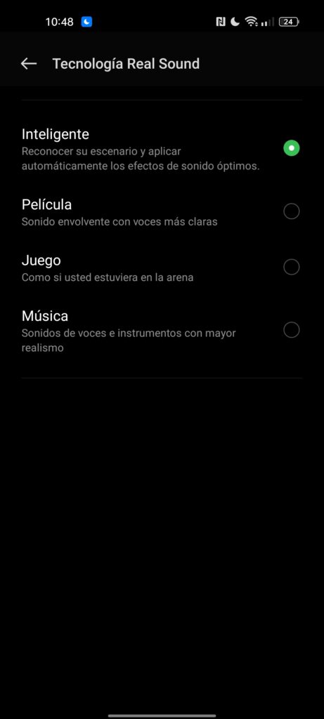 Ahora, en términos de efectos de sonido, acá tenemos mucho de donde jugar, pues contamos con un apartado especial de tecnología Real Sound que nos permite tener 4 estilos predefinidos: inteligente, película, juego y música, donde cada uno de sus usos dependerá de lo que estemos haciendo en ese momento.