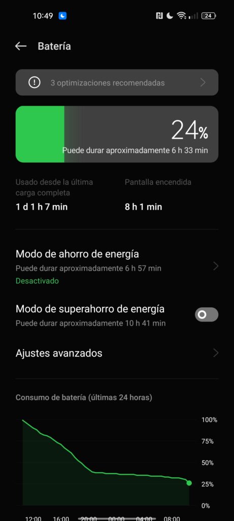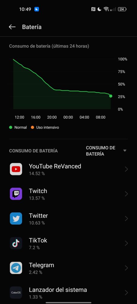 Como podemos ver en las imágenes, en una sesión de 24 horas, usando aplicaciones como YouTube, Twitch, Twitter, TikTok, Telegram, Spotify, Reddit y navegadores web, logré llegar a las 8 horas de pantalla activa de promedio con un 24% de batería restante al final de la jornada con un consumo mixto entre datos móviles y WiFi, siempre con el brillo automático encendido.