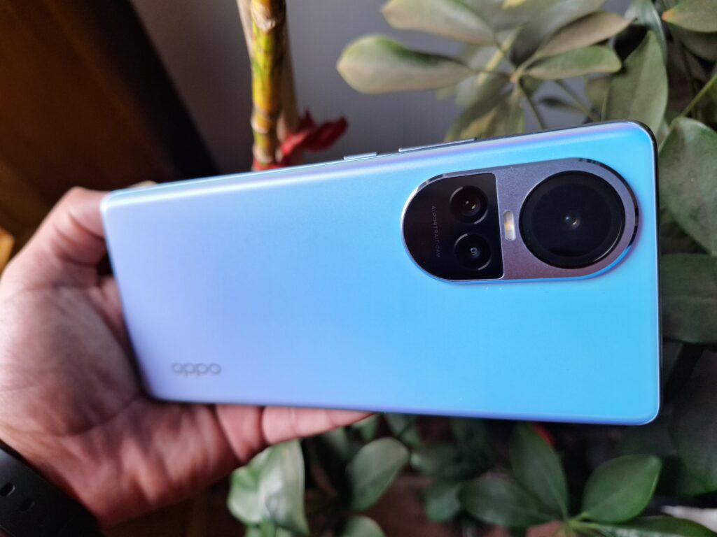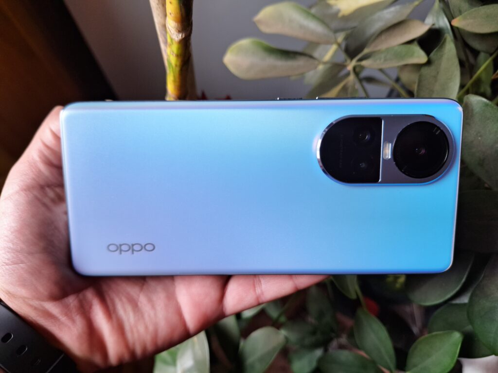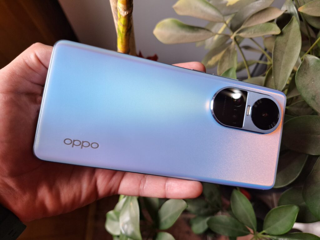 El Oppo Reno10 5G, definitivamente, no es un teléfono que pase desapercibido. La unidad que probamos, de un llamativo color Azul Glacial, muestra un juego de tonalidades que varía con la luz, ofreciendo un aspecto visualmente dinámico. También disponible en Gris Grafito, una opción que personalmente encuentro más atractiva, el Reno10 5G combina estilo y diseño.