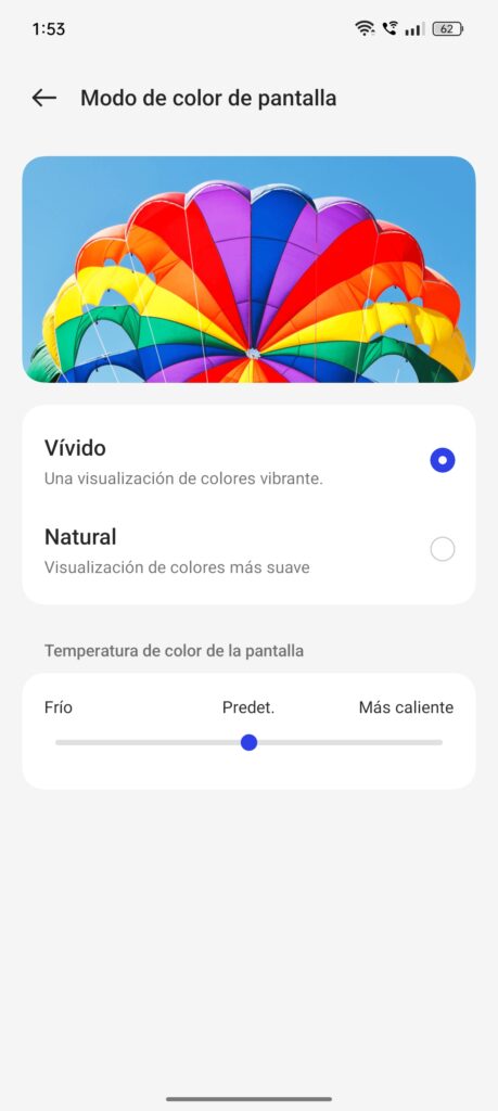 En cuanto a calibración, el dispositivo ofrece dos modos: vívido y natural. La elección entre ambos modos queda al gusto personal del usuario. Adicionalmente, y como un punto que siempre valoro, está la opción de navegación mediante gestos, que en este dispositivo funciona muy bien, aportando una capa adicional de comodidad y modernidad en la interacción con el móvil.