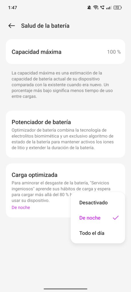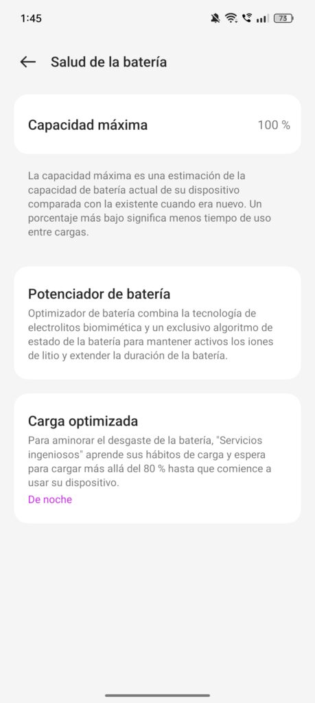 Además, el teléfono incluye funciones útiles como la visualización de la Capacidad máxima de la batería, que permite monitorear su estado a lo largo del tiempo. Esta característica, aunque no esencial para el uso diario, sí agradezco que esté, para así evaluar la salud de la batería tras meses o años de uso. También cuenta con opciones de optimización de batería para extender su duración y una función de Carga optimizada, que ralentiza la carga más allá del 80% para aprender de los hábitos de carga del usuario.