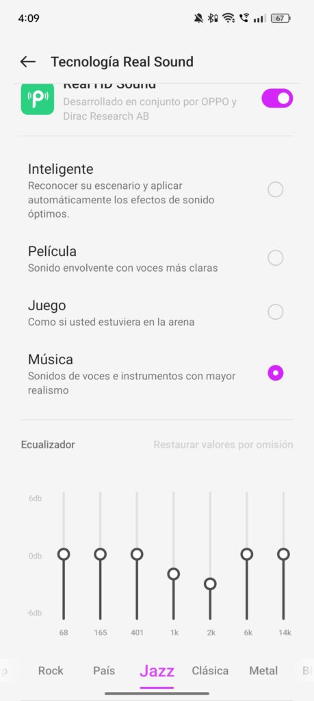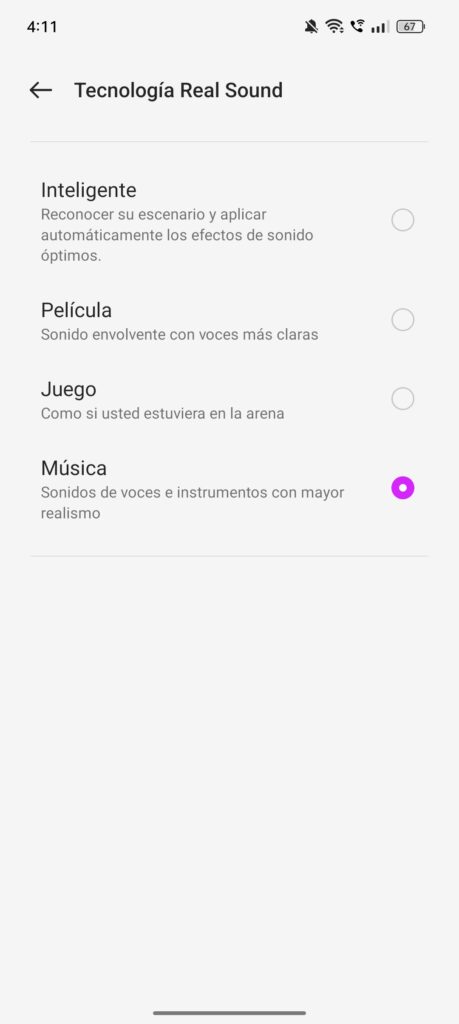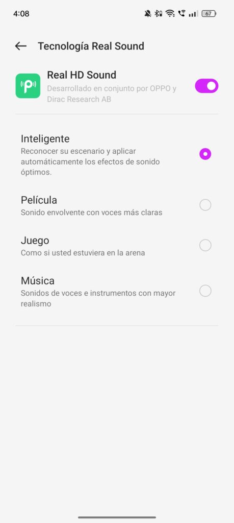 El teléfono también tiene una función llamada Real Sound, que te da acceso a varios ajustes de sonido envolvente. Esto es especialmente útil cuando conectas audífonos, ya que activa opciones adicionales de sonido de alta definición. Sin embargo, me hubiera gustado poder acceder a estas opciones sin necesidad de conectar audífonos, punto negativo que no me agradó. Tampoco cuenta con Dolby Atmos, cuestión que sí tiene la mayoría de otros dispositivos en este rango.