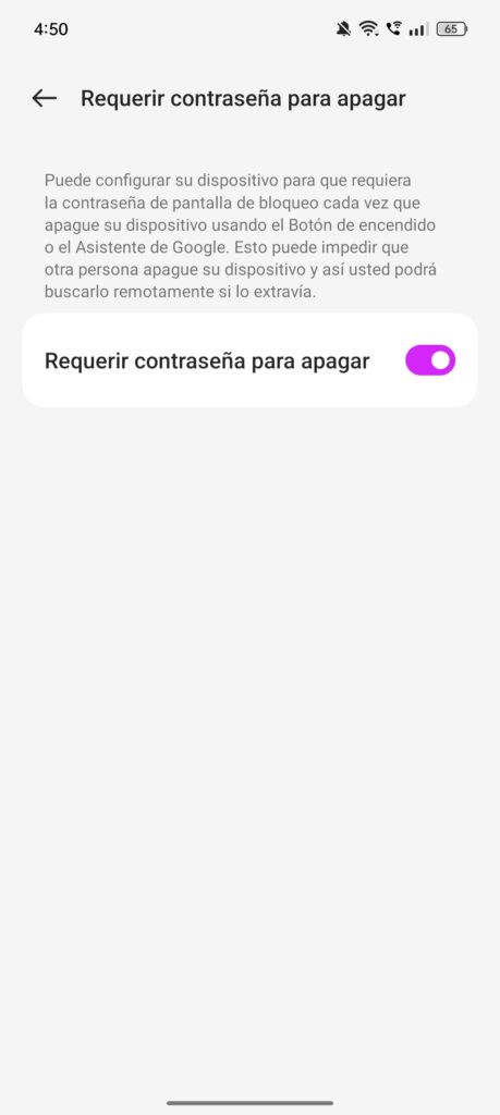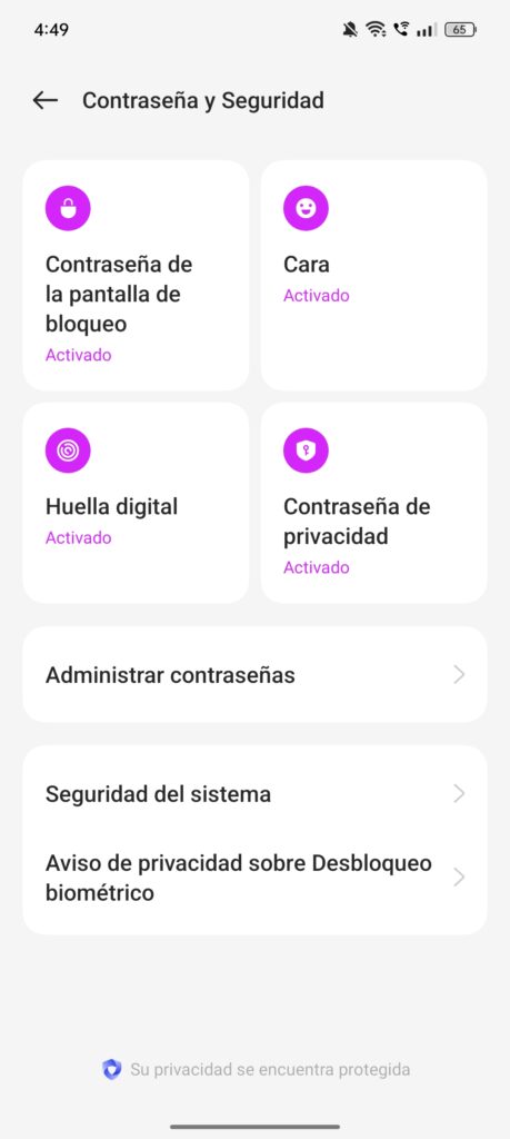 Otro aspecto de seguridad que me pareció destacable es la opción que solicita una contraseña para apagar el móvil, algo muy valioso en caso de robo o extravío. No obstante, es importante mencionar que Oppo no cuenta con un sistema propio de localización del dispositivo, por lo que hay que confiar en las herramientas de Google para este propósito. Aunque esto funciona, personalmente no me genera tal confianza como los sistemas de búsqueda ofrecidos por otras marcas.