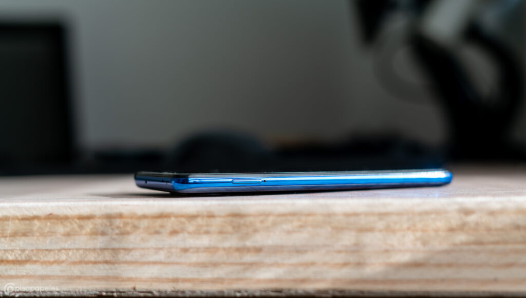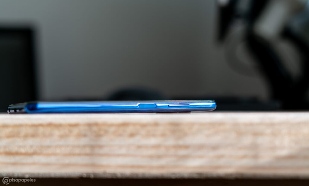 Por la parte frontal nos encontramos con la tremenda pantalla de 6.67 pulgadas, que además incluye la cámara de selfies y el parlante de llamadas en la parte de arriba de esta. Por la derecha están los controles del volumen, y el botón de encendido/apagado, el cual además funciona como lector de huellas dactilares. Por la izquierda solamente nos encontramos con la bandeja para la tarjeta SIM y Micro-SD.