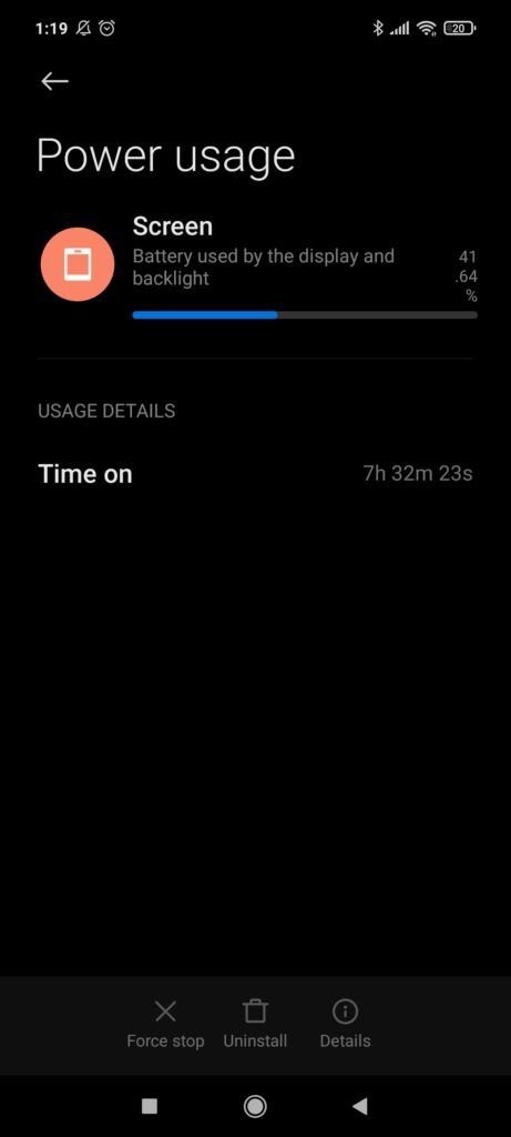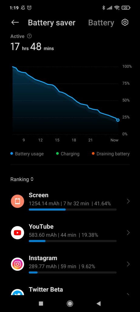 Como podrán ver en los pantallazos adjuntos, cuando llegué al 20% de batería, llevaba casi 18 horas activo (desde que fue desconectado del cargador), y logré sacarle siete horas y media de pantalla. Todo esto con la tasa de refresco máxima activada, WiFi encendido, y con un Fitbit Inspire 2 conectado vía Bluetooth.