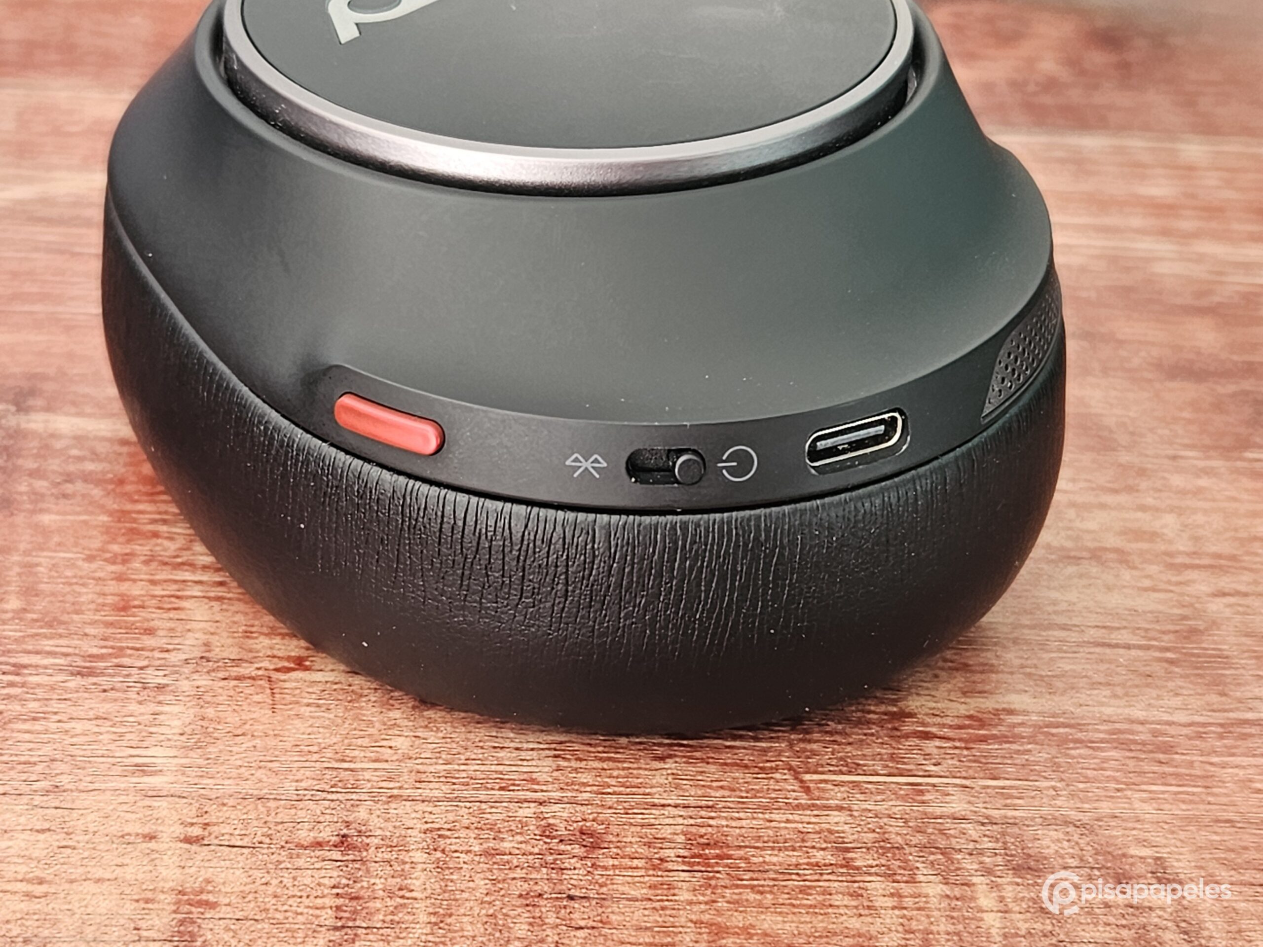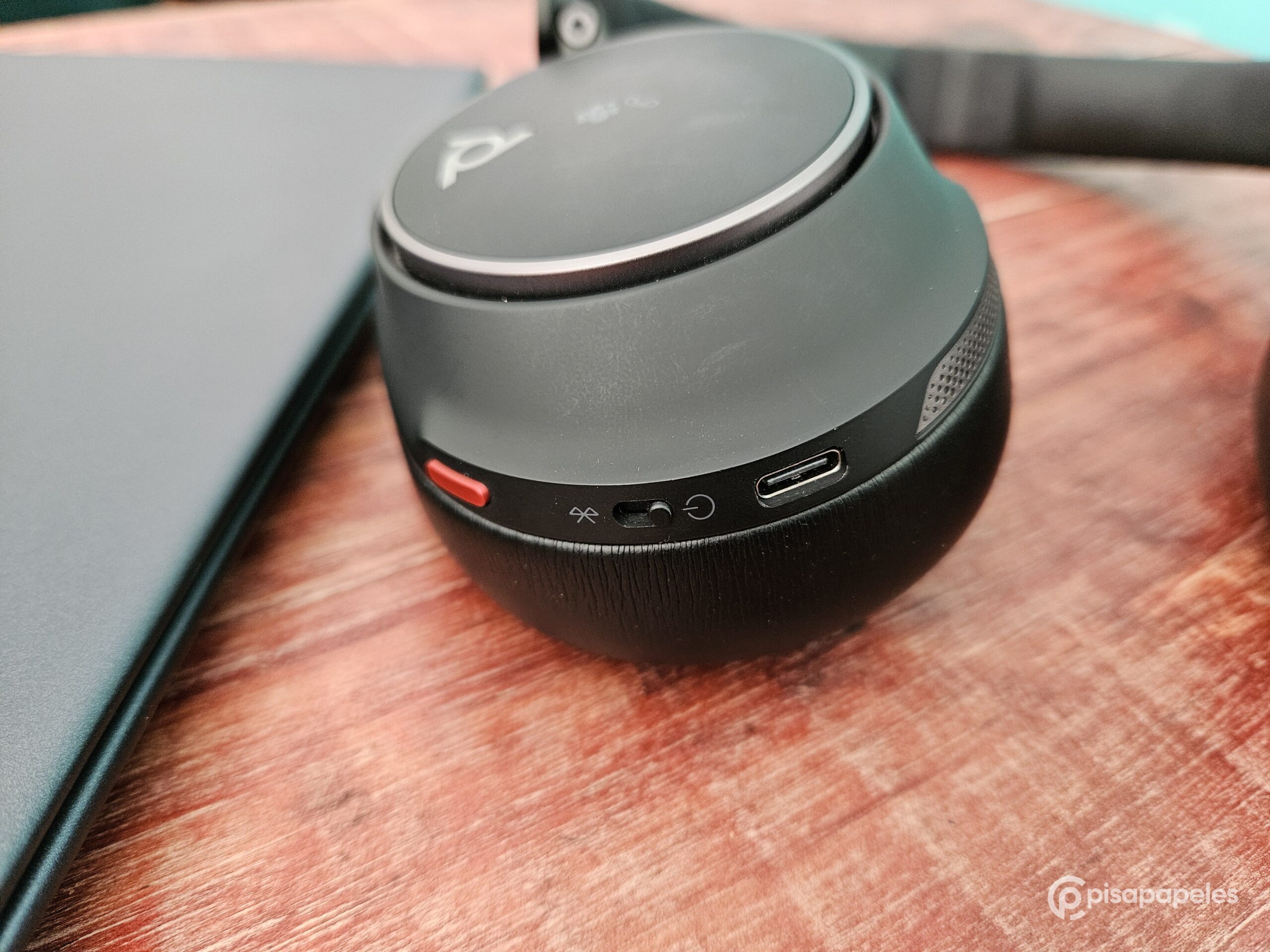 En el audífono derecho se encuentran los botones físicos: un interruptor de encendido/Bluetooth y el botón multifunción de color rojo junto con el puerto de carga USB-C. También se encuentra una interfaz táctil en el audífono derecho, donde puedes ajustar el volumen, adelantar a la siguiente canción o contestar llamadas. También hay una forma de configurar una acción personalizada en la aplicación Poly Lens para los controles táctiles.