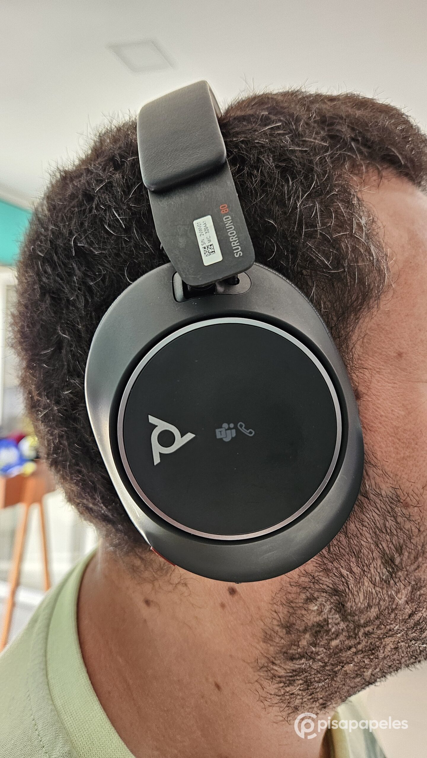 El Voyager Surround 80 UC tiene un diseño típico de audífonos cerrados, con acolchado amplio y mullido de piel sintética en los audífonos y la diadema. A primera vista, no tiene un aspecto típico "corporativo". Sin embargo, al observar de cerca el exterior del audífono derecho, se revelan iconos tenues de Teams y teléfono, lo que delata su intención como un producto destinado al entorno laboral. Aunque se comercializa como certificado para Teams, este audífono también es compatible con otras plataformas de reuniones como Zoom.