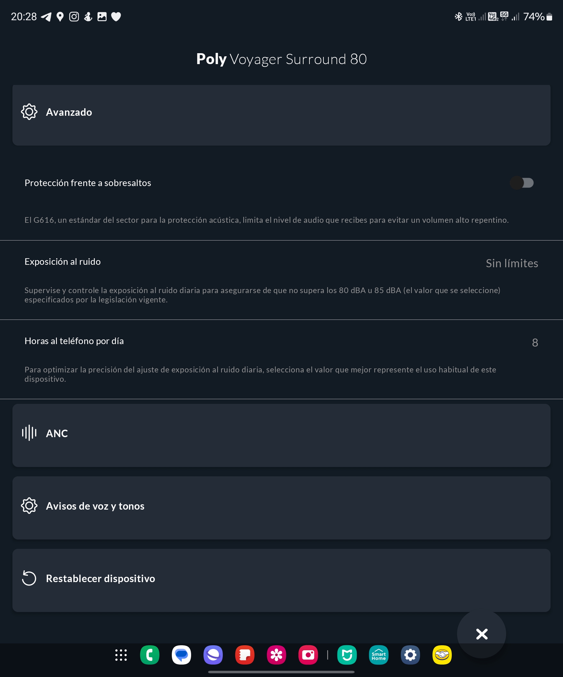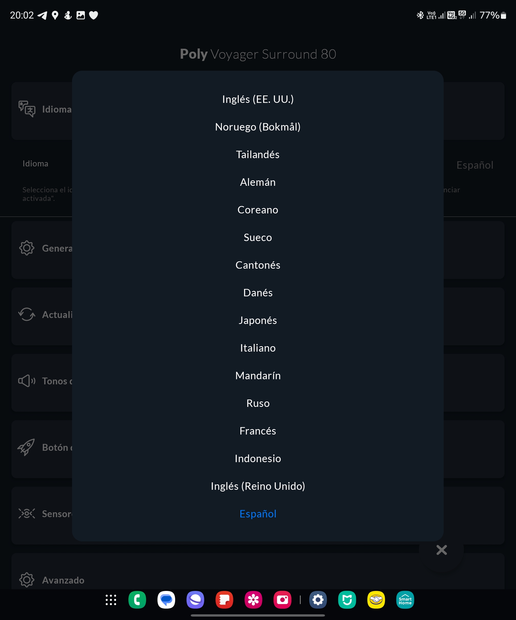 En este apartado podemos cambiar el idioma de la voz que escucharás en los audífonos. Dicha voz te indicará cuando la batería esté baja, cuando entra una llamada, te indicará qué dispositivos se han conectado y desconectado de los audífonos. Por ejemplo, si lo tengo sincronizado con mi smartphone y computador, la voz mencionará “PC conectado, teléfono 1 conectado”. También te alerta cuando hayas alcanzado el volumen máximo, entre otros avisos.