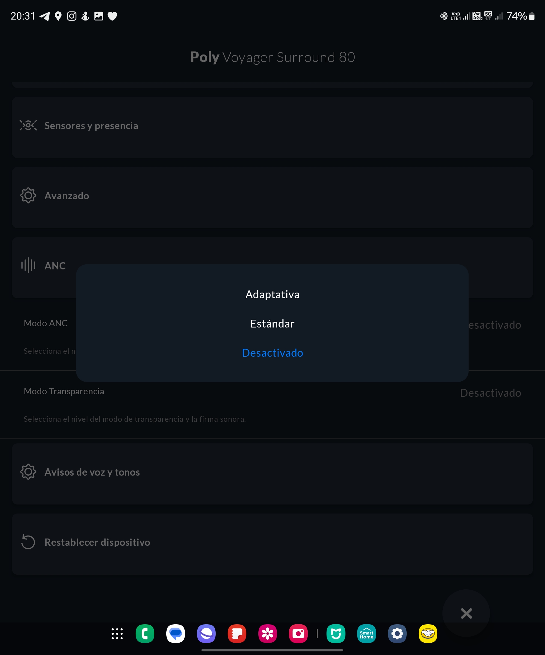 Acá vamos a poder elegir qué modo de cancelación de ruido queremos utilizar, entre “Adaptativa” o “Estándar”, o simplemente desactivarlo.