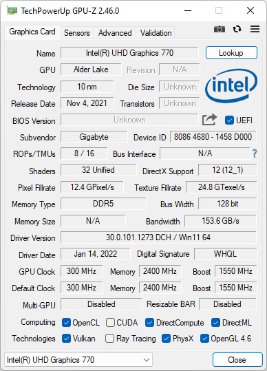 Pues bien, volviendo a nuestro protagonista, el Intel Core i9-12900K incluye una GPU integrada Intel UHD Graphics 770. A su vez esta cuenta con 32 unidades de ejecución, 256 shaders, una frecuencia base de 300 MHz con un máximo de 1.550 MHz. Todo lo anterior permite entregar 1.484 GFLOPS en FP16 y 742 GFLOPS en FP32.