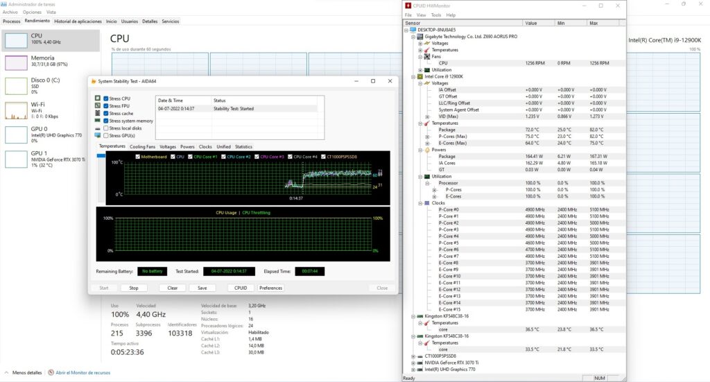 Después de dejar al PC estresarse por más de 7 minutos, la CPU estabilizó la frecuencia de los P-Core en 4.9 GHz con un leve Thermal Throttling, ya que el máximo es de 5.1 GHz. Así mismo, los E-Core quedaron en 3.7 GHz, evidenciando también una leve estrangulación térmica, debido a que el máximo es de 3.9 GHz. Mientras que la temperatura promedio alcanzada por el procesador fue de 72°C con un máximo de 82°C.