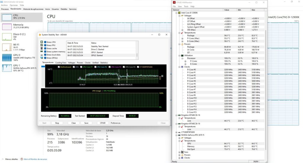 En nuestra segunda prueba utilizamos las mismas aplicaciones, pero cambiamos los parámetros agregando estrés a la unidad SSD y la GPU, adicionalmente a los parámetros anteriores como CPU, FPU, Caché y RAM.