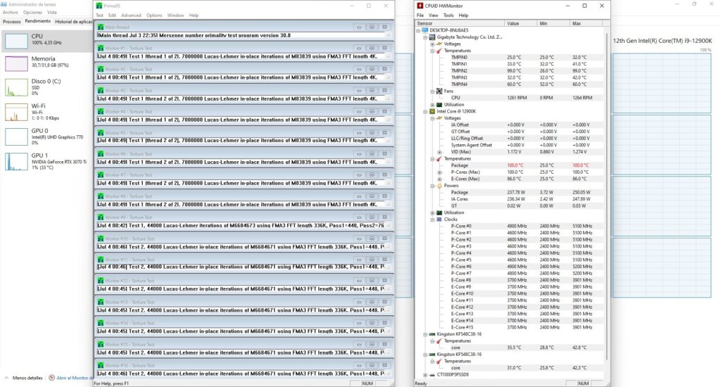 Finalmente, realizamos una tercera prueba para estresar todavía más al Intel Core i9-12900K. Pero ahora usamos Prime95 como la aplicación elegida para llevar al límite a la CPU. Luego de ejecutarlo por varios minutos, acá prácticamente sacamos fuego al PC, y notamos que el package o conjunto de los núcleos llegó a los 100°C. De hecho, estábamos casi al límite de potencia usando 237 W como lo demuestra la captura de más adelante, quedando muy cerca del máximo de 241 W.