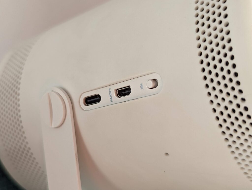 El proyector está fabricado en aluminio en color blanco, en su costado se pueden encontrar las entradas USB-C y micro HDMI 1.4, así como un switch para apagar el micrófono integrado.