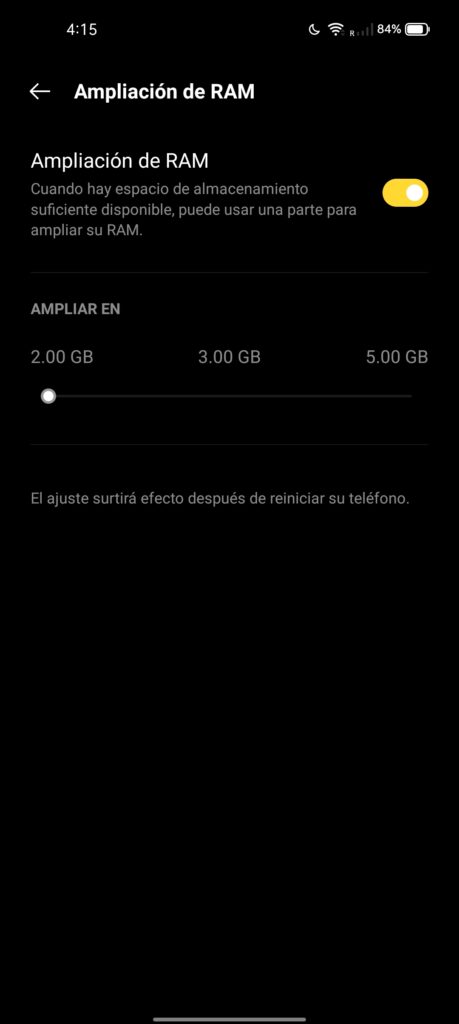 En cuanto a la memoria RAM, nos encontramos con 4GB o 6GB, y de almacenamiento interno tenemos 64GB o 128GB UFS 2.1, nosotros probamos la versión con 6GB de memoria RAM, que pueden ser ampliados mediante la herramienta de RAM virtual que ofrece Realme hasta en 5GB adicionales.
