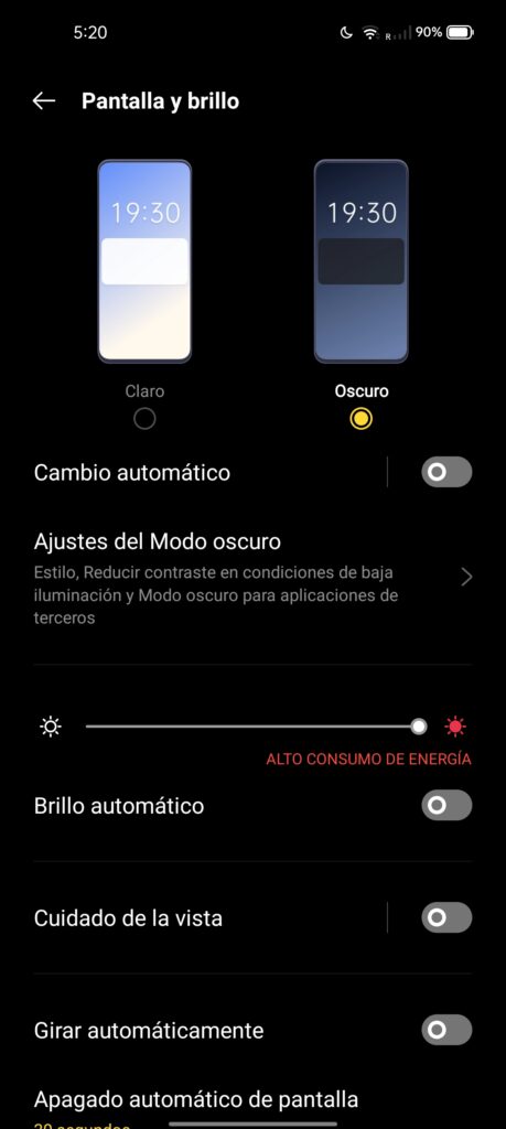 Realme nos ofrece también la posibilidad de calibrar los colores de pantalla, con colores tenues o colores más vibrantes, además de contar con un switch para el efecto visual OSIE que mejora la visualización de estos colores, así que si tenemos una inclinación por pantallas más o menos saturadas en colores, entonces podemos elegir, así como también podremos elegir entre tasa de refresco de 60Hz o 90Hz.