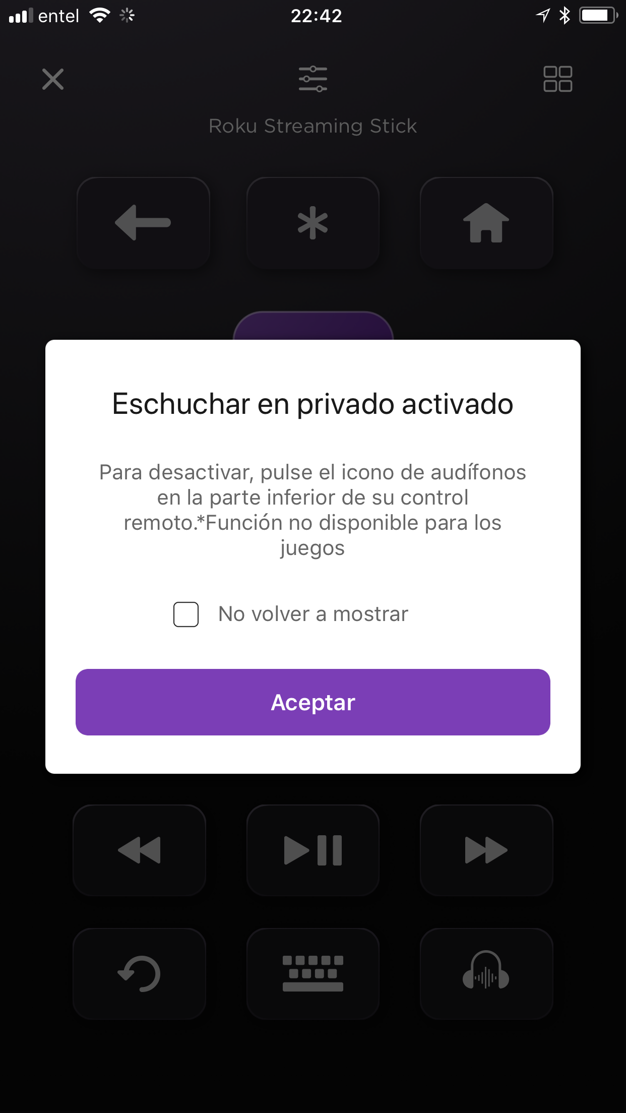 Finalmente tenemos la aplicación Roku la cual es muy completa, reemplaza fácilmente el control remoto físico y funciona excelente. Lejos por lo mejor es su opción Escucha en privado, el que nos permitirá usar nuestro smartphone para escuchar el audio de nuestro Roku y con unos audífonos escuchar tan fuerte como deseas sin molestar en la casa, ni a nadie.