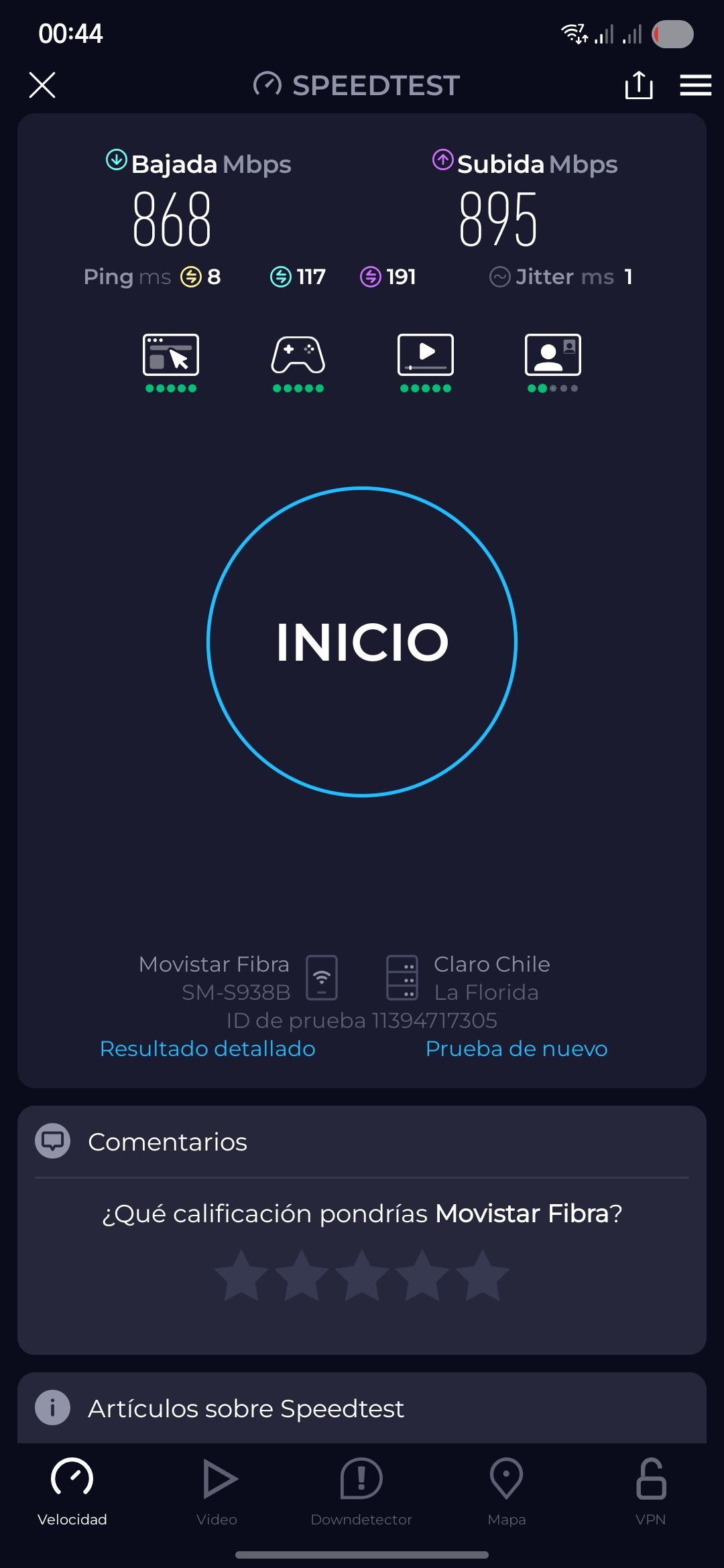 En la habitación donde se encontraba el router principal, a aproximadamente un metro de distancia, la conexión alcanzó velocidades cercanas a los 868 Mbps de descarga y 895 Mbps de subida. En el dormitorio contiguo, separado por una pared y a unos ocho metros, el rendimiento se mantuvo sólido, superando los 560 Mbps de bajada y los 500 Mbps de carga.
