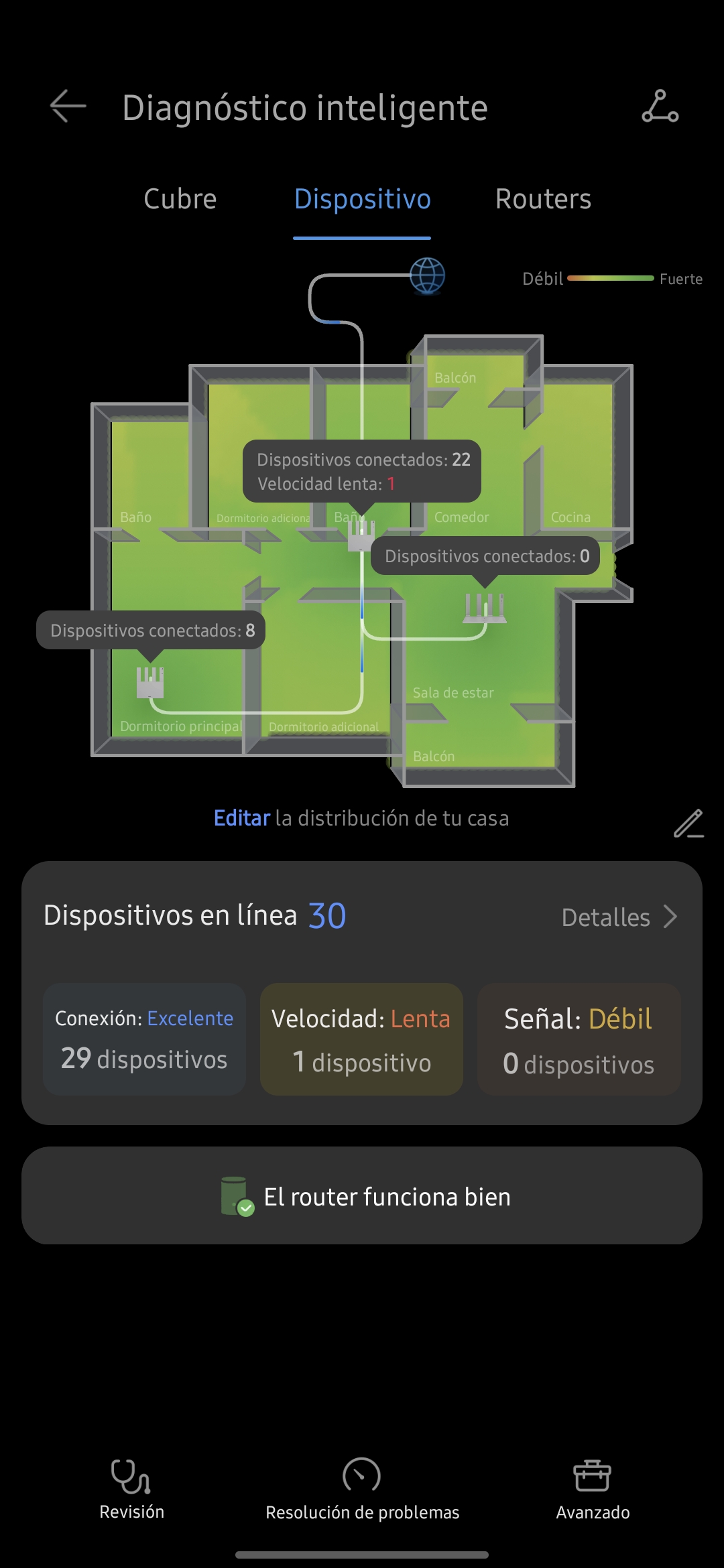 Una vez que ingreses a la app, te encontrarás con un mapa de la distribución de tu casa, el cual puedes editar para tener una mejor visión, aunque no es necesario modificarlo. Este mapa te mostrará cuántos routers de Huawei compatible tienes conectados y te mostrará el nivel de señal Wi-Fi que está llegando a cada extremo del hogar.