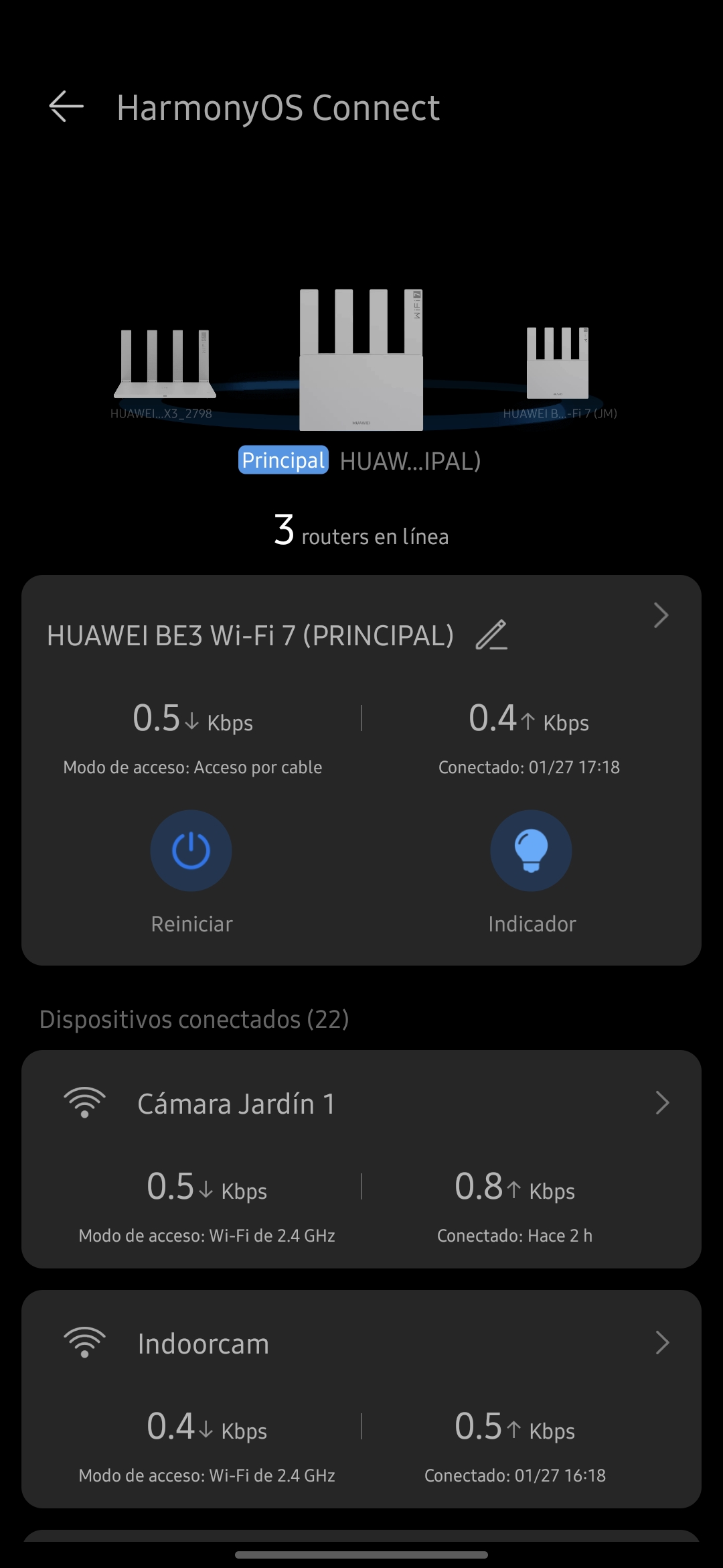 En mi caso, tengo dos Huawei BE3 y un Huawei AX3, todos conectados por cable, aunque también puedes hacer lo mismo de manera inalámbrica, aunque la calidad de señal Wi-Fi no será la misma.