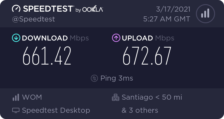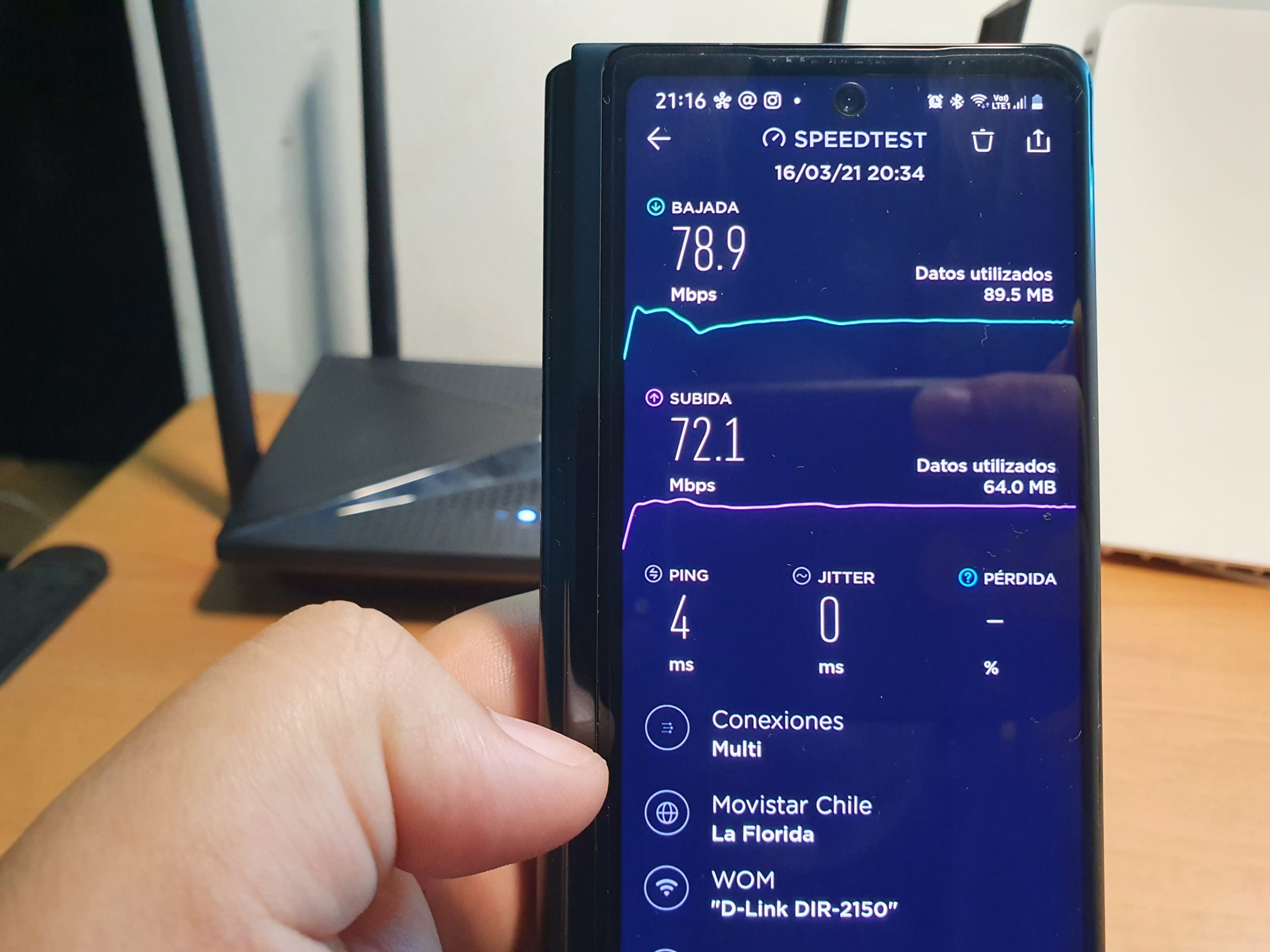 También probé las redes Wi-Fi 2.4 y 5 GHz del router de WOM (un Huawei EchoLife HG8245Q2) estando al lado de él para que podamos comparar con los resultados obtenidos con nuestro protagonista: