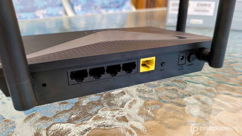 También tenemos el botón de reset, así como también el botón WPS para que los dispositivos compatibles puedan conectarse automáticamente sin buscar red ni tampoco ingresar contraseña. Además, está el botón de encendido y apagado, y la conexión a la energía eléctrica.