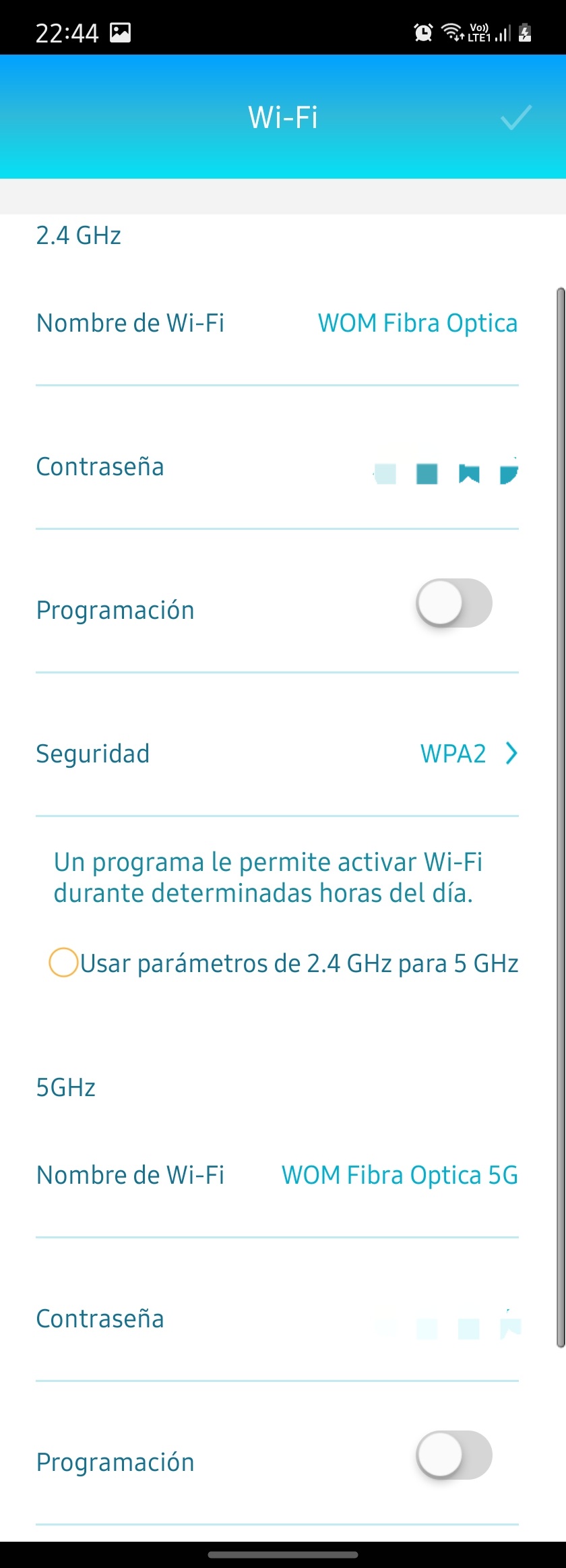 Aquí podemos ver parte de los ajustes disponibles para nuestra red Wi-Fi, y podemos cambiar el nombre de la red, la contraseña, aplicar una programación para que la red esté activa o desactivada, seleccionar el modo de seguridad (Legacy WPA/WPA2, WPA2, WPA2/WPA3, y WPA3), y por último tenemos un botón que nos permitirá separar la red 2.4 y 5 GHz para poder diferenciarlas (como será en nuestro caso).