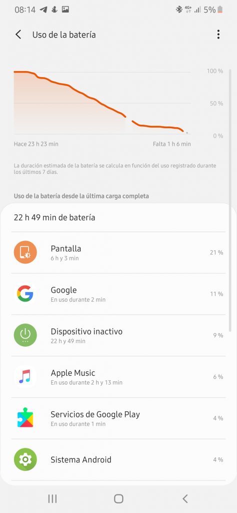 Con el uso descrito anteriormente, el A50 me entregó una duración total de 23 horas aproximadamente, mientras que en pantalla activa logró entregarme 6 horas con 3 minutos.