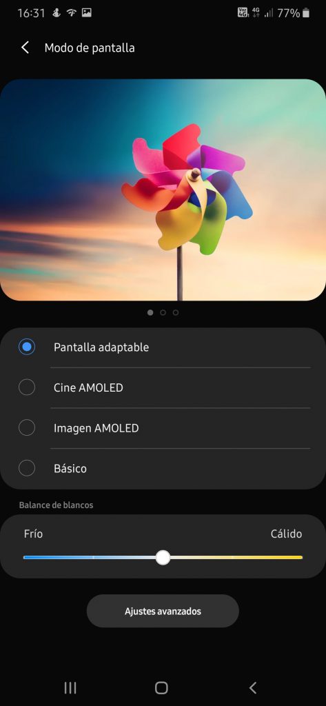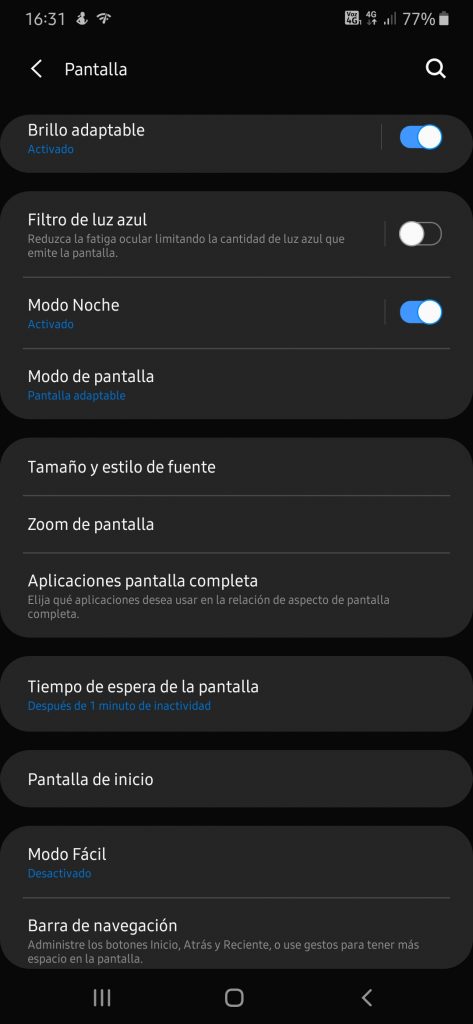 En cuanto a ajustes disponibles, tenemos la opción de controlar el brillo, aplicar un filtro de luz azul, activar el Modo Noche que pone la interfaz de color negro, podremos controlar la intensidad del color y el balance de blancos.