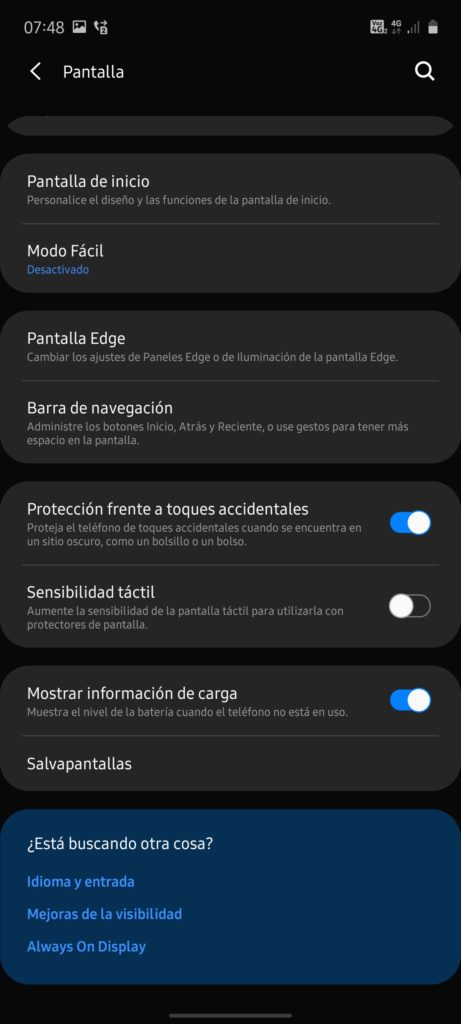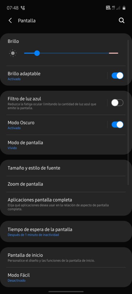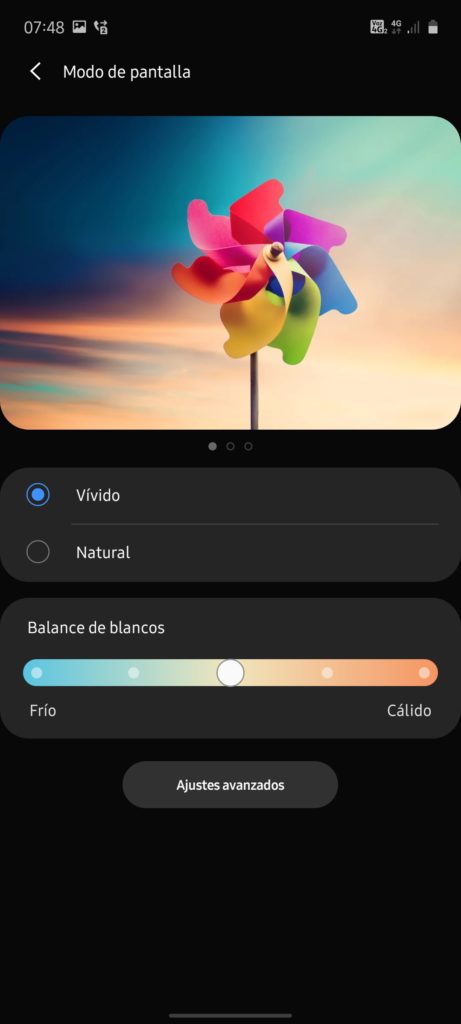 En cuanto a opciones disponibles, vamos a poder activar el modo oscuro, modificar el modo de pantalla entre vívido o natural (y modificar el balance de blancos), adaptar el tamaño y estilo de fuente, zoom de pantalla, aumentar la sensibilidad táctil, entre otras opciones.