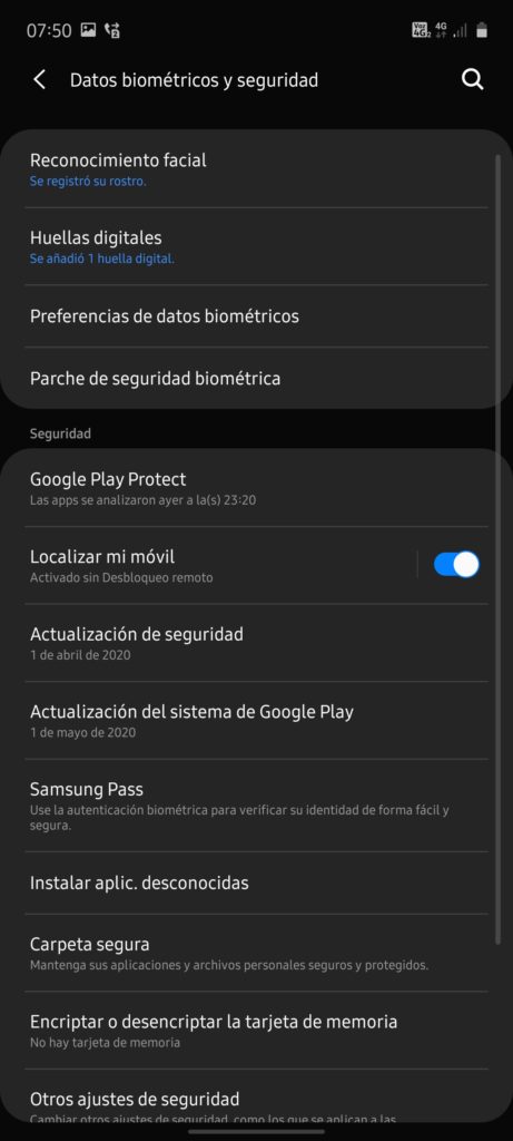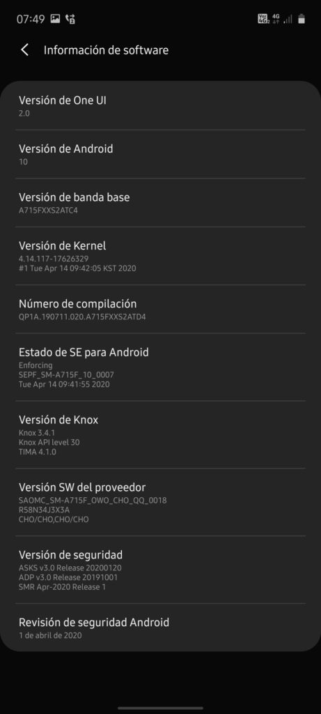 El parche de seguridad que tenía el equipo al momento de probarlo correspondería al mes de abril del 2020, mientras que la actualización del sistema de Google Play estaba actualizada al mes de mayo del 2020.