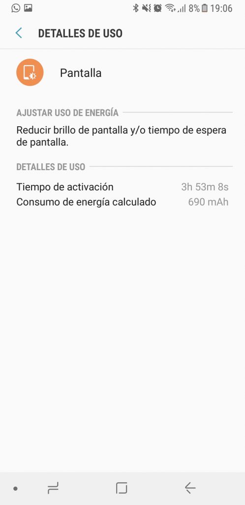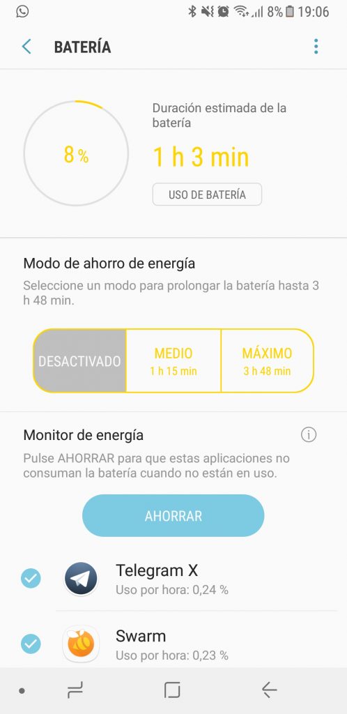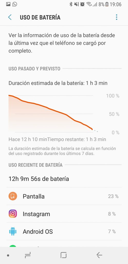 Aquel día de prueba, el dispositivo se desconectó con un 100% de batería a las 6:50 de la mañana aproximadamente, y al momento de tomar estos pantallazos, el teléfono contaba con un 8% a las 19:06. En total, el dispositivo duró 12 horas y 10 minutos, y el uso de pantalla quedó en las 3 horas y 53 minutos, y de acuerdo al mismo sistema, todavía le quedaba una hora más de uso. Nada mal a mi parecer.