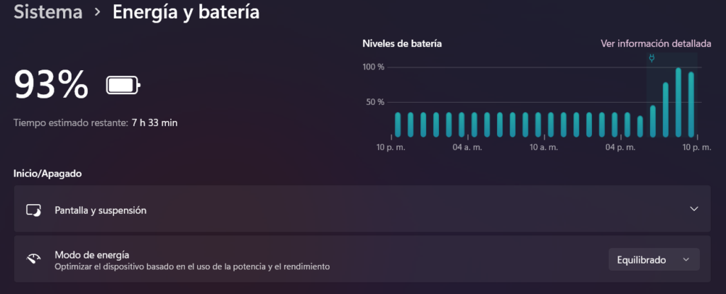 Según mi propia experiencia, nuestro protagonista me dio una autonomía de 11 horas aproximadamente, con el brillo de la pantalla un poco más de la mitad, utilizando Microsoft Edge con no más de 7 pestañas abiertas, y Spotify corriendo en segundo plano junto con la aplicación de Correo de Windows.