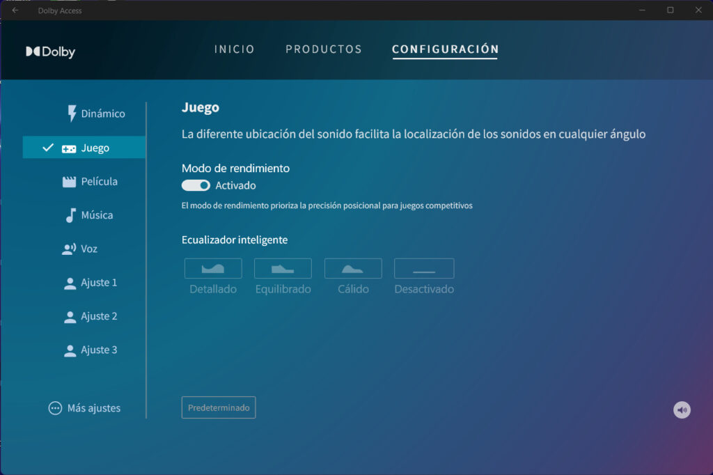 Y para mejorar la calidad de sonido aún más, tenemos acceso a la aplicación Dolby Access en donde encontraremos cinco perfiles pre-ecualizados: Dinámico, Juego, Película, y Voz, además de otros tres perfiles que son personalizados. Estos perfiles te dan acceso a un ecualizador de 10 bandas y activar la opción "Virtualizador de sonido envolvente".